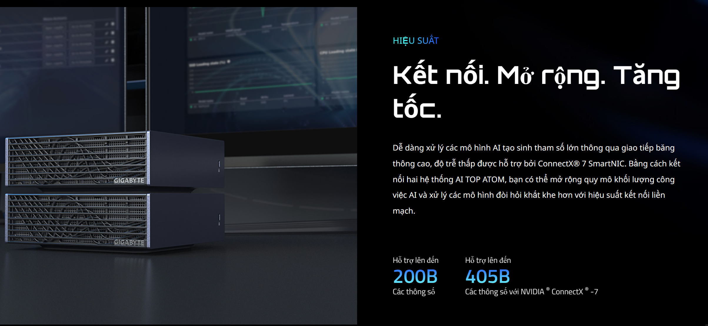 - Kết nối và mở rộng quy mô không giới hạn Điểm đột phá của AI TOP ATOM nằm ở khả năng mở rộng quy mô một cách linh hoạt. Được trang bị card mạng thông minh NVIDIA ConnectX-7, bạn có thể dễ dàng kết nối hai hệ thống ATOM lại với nhau thông qua công nghệ NVLink™-C2C, tạo thành một cụm siêu máy tính mini với hiệu năng được nhân đôi. Khả năng này cho phép bạn xử lý các mô hình AI tạo sinh với tham số cực lớn lên tới 405 tỷ, một nhiệm vụ vốn chỉ dành cho các trung tâm dữ liệu khổng lồ trước đây.