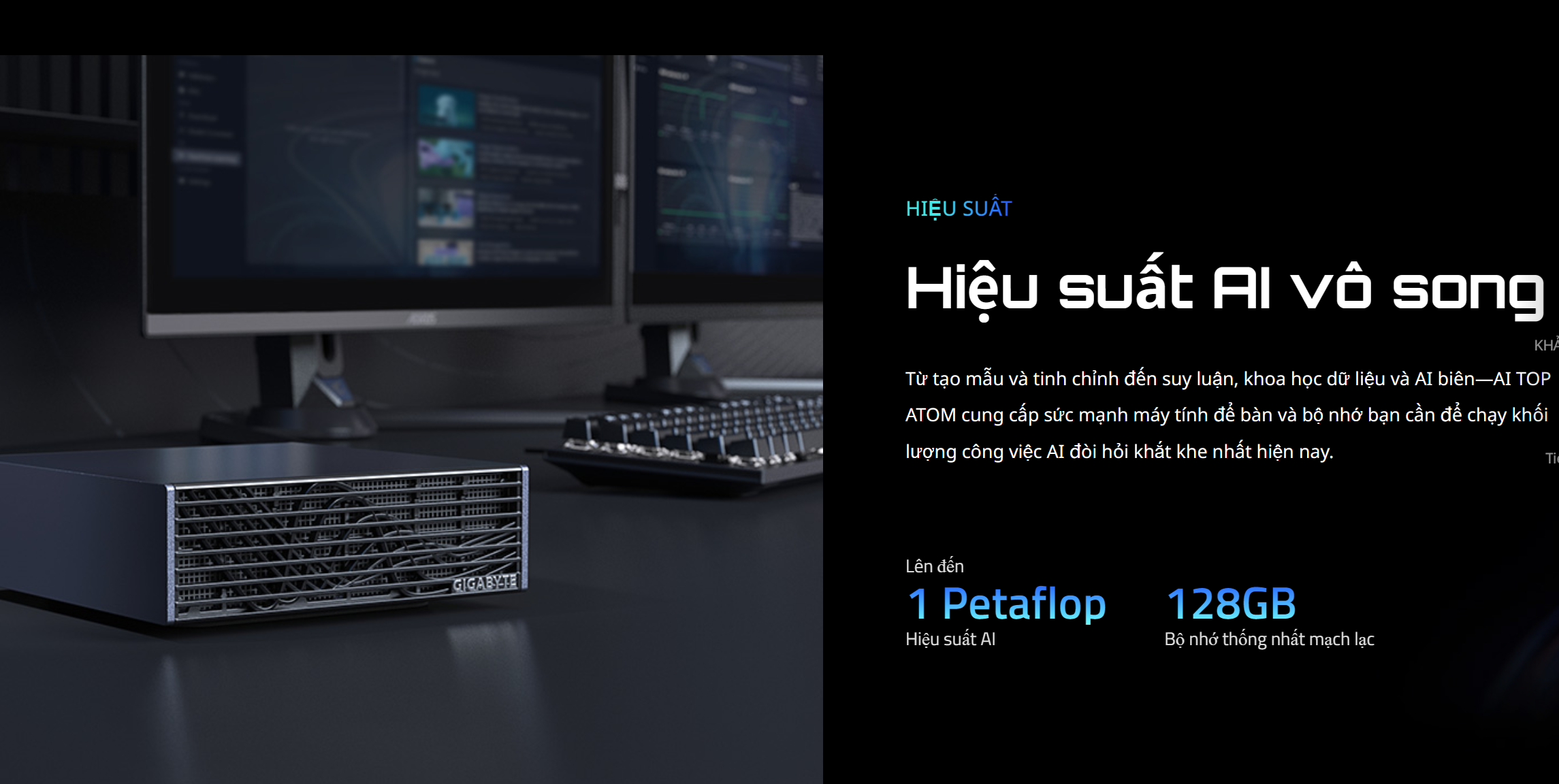 - Sức mạnh Petaflop - Tái định nghĩa hiệu năng AI tại chỗ Đừng để kích thước đánh lừa bạn, bởi cốt lõi của ATOM là siêu chip NVIDIA GB10 Grace Blackwell mang đến hiệu năng AI lên tới 1 Petaflop (một triệu tỷ phép tính mỗi giây). Điều này có nghĩa là bạn có thể rút ngắn thời gian huấn luyện (training) và tinh chỉnh (fine-tuning) các mô hình AI phức tạp từ hàng tuần xuống chỉ còn vài ngày. Bộ nhớ hợp nhất 128GB LPDDR5x cho phép xử lý các bộ dữ liệu khổng lồ và mô hình ngôn ngữ lớn (LLM) một cách trơn tru, loại bỏ hoàn toàn các nút thắt cổ chai, mang lại trải nghiệm phát triển AI liền mạch chưa từng có.