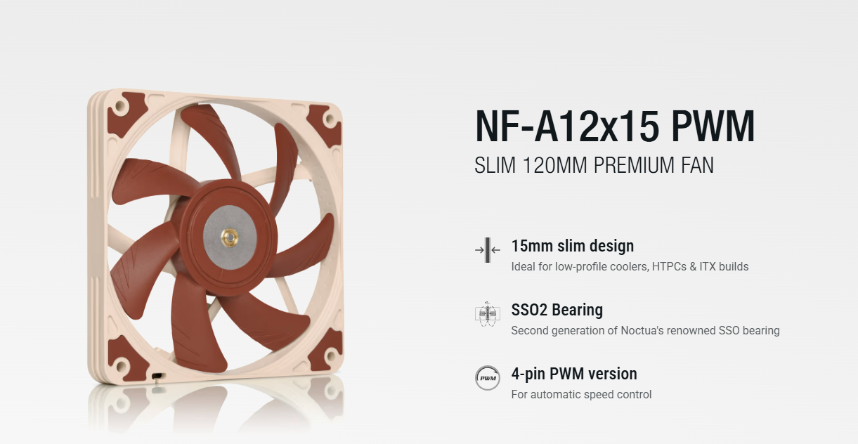 Quạt tản nhiệt Noctua NF-A12x15 PWM là mẫu quạt 120mm thuộc dòng "Slim" (siêu mỏng) của Noctua. Trong khi các quạt 120mm tiêu chuẩn thường dày 25mm, NF-A12x15 chỉ dày vỏn vẹn 15mm. Đây là thành quả của quá trình nghiên cứu kỹ thuật phức tạp nhằm mang lại lưu lượng gió và áp suất tĩnh mạnh mẽ trong một thân hình cực kỳ mỏng gọn. Nó là lựa chọn hàng đầu cho các thùng máy Mini-ITX, các bộ tản nhiệt CPU bị giới hạn không gian hoặc dùng để lắp đặt ở các vị trí hẹp trong vỏ case.