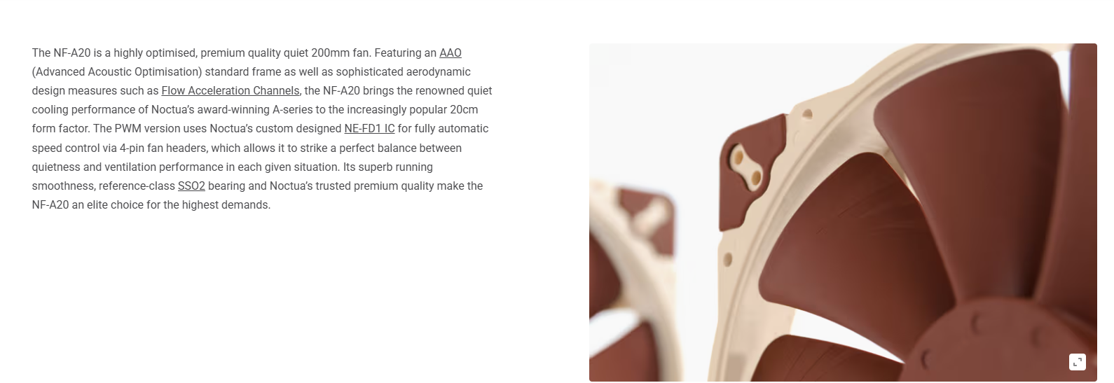 Khung quạt được tích hợp các miếng đệm chống rung bằng cao su và thiết kế bề mặt bên trong dạng vi cấu trúc (Stepped Inlet Design). Ngay cả khi hoạt động ở công suất tối đa, NF-A20 vẫn duy trì được độ ồn cực thấp, chỉ khoảng 18,1 dB(A) – gần như không thể nghe thấy trong môi trường phòng thông thường.