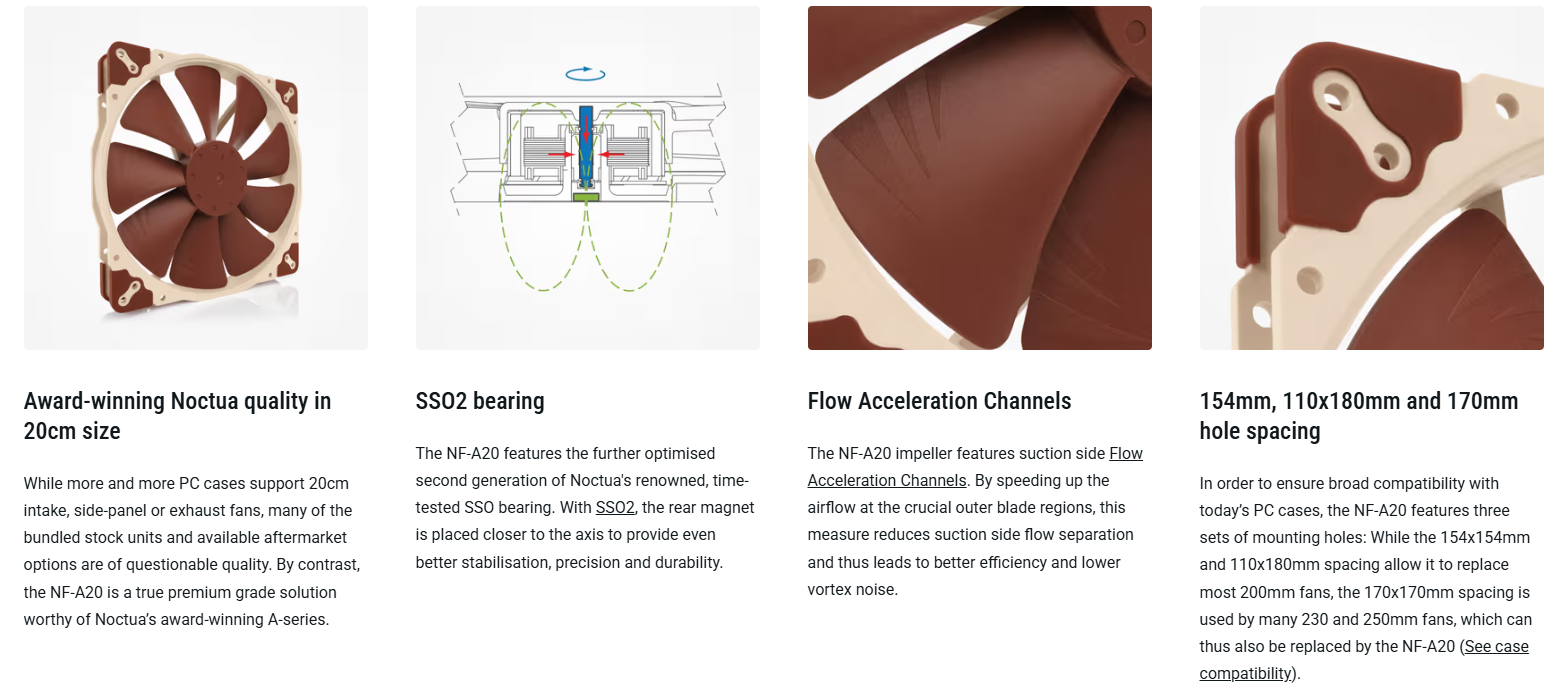 Giống như các dòng quạt cao cấp khác của hãng, NF-A20 sở hữu các rãnh tăng tốc dòng khí trên đầu cánh quạt. Điều này giúp giảm nhiễu loạn luồng gió ở các mép cánh, tăng hiệu quả làm mát và giảm đáng kể tiếng ồn khí động học.