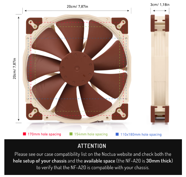 Điểm yếu của quạt 200mm trên thị trường là mỗi hãng case lại có vị trí bắt vít khác nhau. Noctua đã giải quyết vấn đề này bằng cách trang bị cho NF-A20 tới 3 bộ lỗ bắt vít khác nhau (154x154mm, 110x180mm và 170x170mm), giúp nó tương thích với hầu hết các vỏ case hỗ trợ quạt 200mm hiện nay.