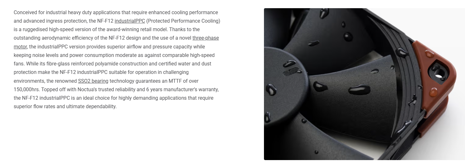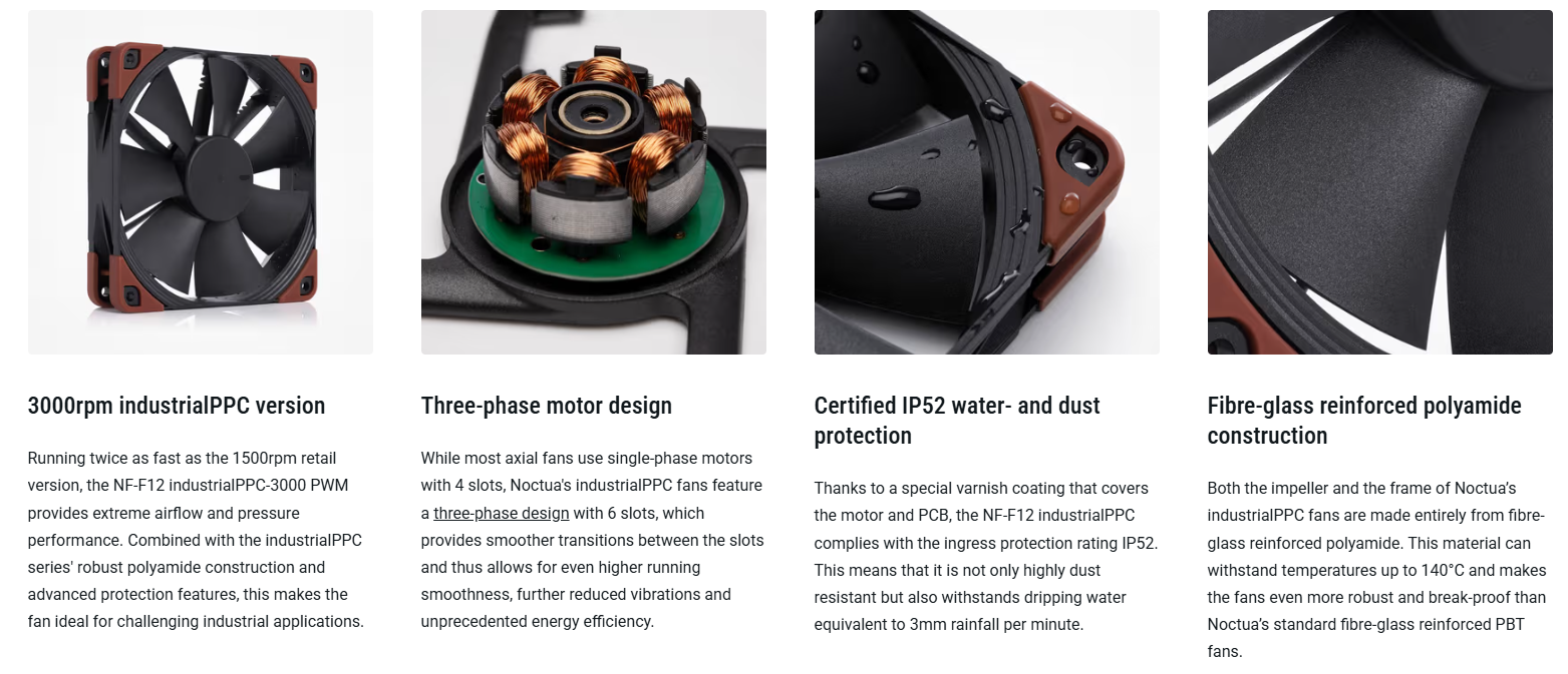 Động cơ và bảng mạch của dòng industrialPPC được phủ một lớp nhựa đặc biệt, giúp quạt đạt tiêu chuẩn IP52. Điều này có nghĩa là quạt có khả năng chống bụi xâm nhập và chịu được những giọt nước nhỏ trực tiếp, đảm bảo độ tin cậy trong môi trường công nghiệp hoặc các hệ thống tản nhiệt nước phức tạp.