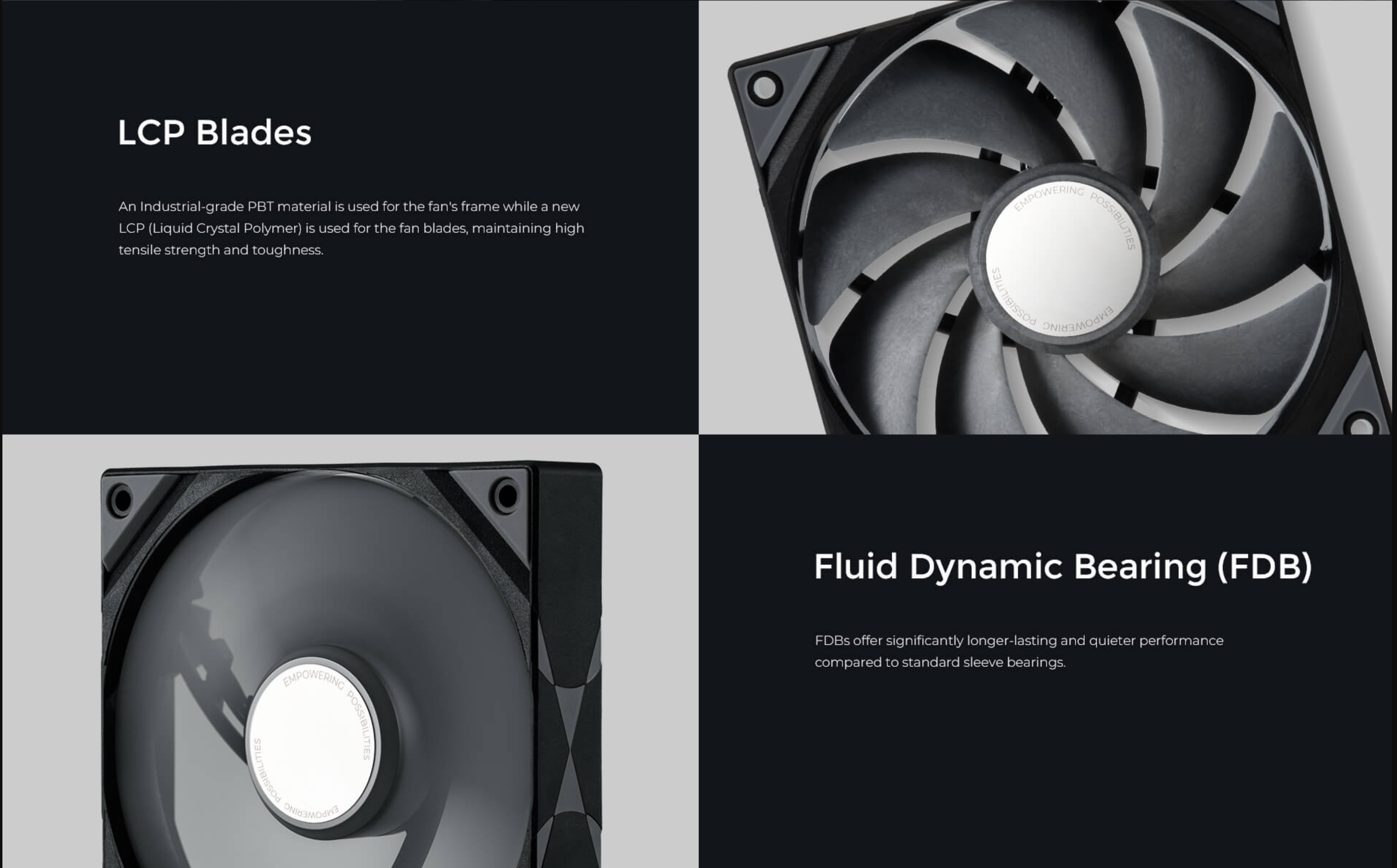 Hoạt động êm ái, bền bỉ: Sử dụng vòng bi Fluid Dynamic Bearing (FDB), quạt hoạt động cực kỳ êm ái với độ ồn chỉ 30.97 dBA. Loại vòng bi này còn có tuổi thọ cao hơn so với các loại vòng bi truyền thống, đảm bảo quạt hoạt động ổn định và bền bỉ trong thời gian dài.