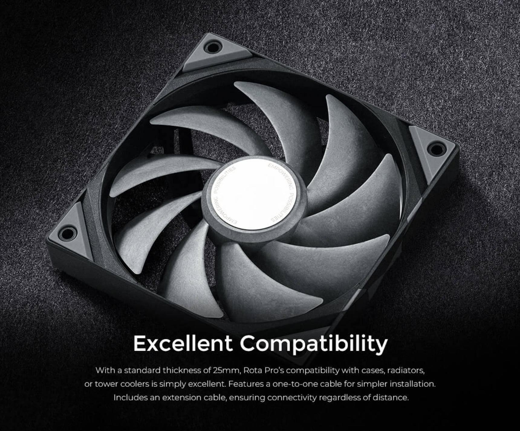 Hiệu suất làm mát mạnh mẽ: Với tốc độ quạt từ 500 - 2250 RPM, quạt ROTA PRO 120mm tạo ra lưu lượng gió lên đến 81.32 CFM và áp suất tĩnh 3.66 mmAq. Những thông số này đảm bảo luồng không khí được đẩy mạnh mẽ và tập trung, làm mát hiệu quả cho các radiator, tản nhiệt khí và các khu vực khó tiếp cận.
