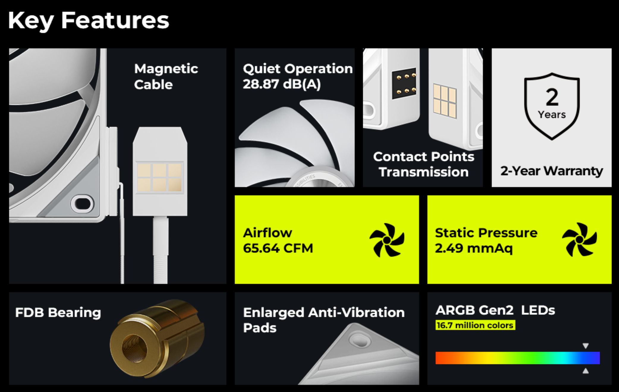 Hoạt động êm ái, bền bỉ: Sử dụng vòng bi Fluid Dynamic Bearing (FDB), quạt hoạt động cực kỳ êm ái với độ ồn chỉ 32 dBA. Loại vòng bi này còn có tuổi thọ cao hơn so với các loại vòng bi truyền thống, đảm bảo quạt hoạt động ổn định trong thời gian dài.