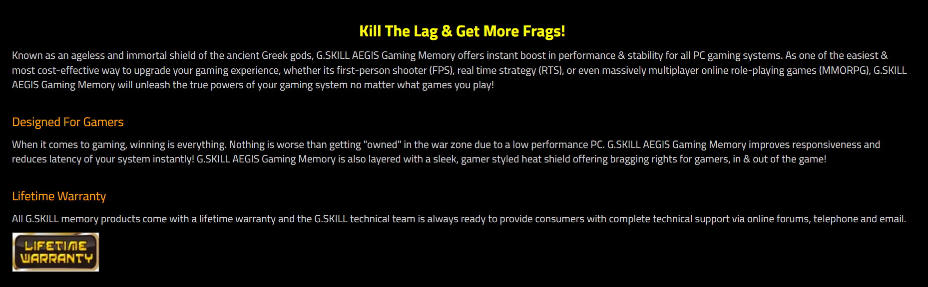 Ram G.Skill Aegis DDR3 được sản xuất với các linh kiện chất lượng cao, trải qua quá trình kiểm tra nghiêm ngặt của G.Skill, một thương hiệu hàng đầu thế giới về bộ nhớ. Điều này giúp đảm bảo sự ổn định và độ bền lâu dài cho hệ thống của bạn.