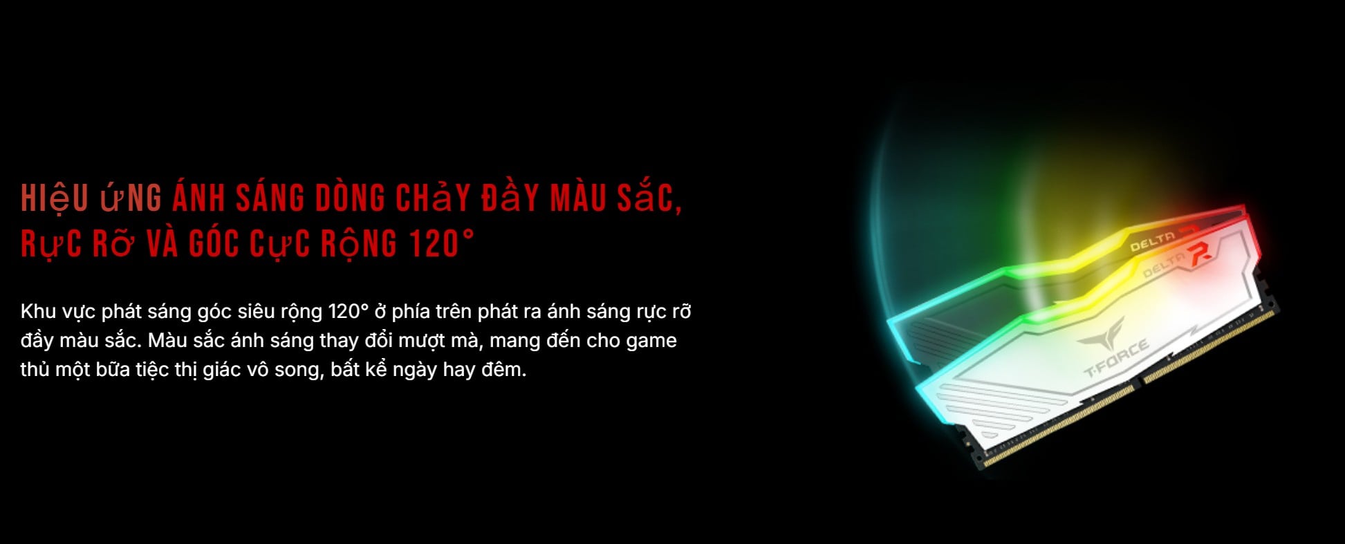 Ánh sáng RGB độc đáo: Điểm nhấn nổi bật nhất của T-Force Delta RGB là dải đèn LED RGB đầy đủ, chiếm 120° trên bề mặt tản nhiệt. Hiệu ứng ánh sáng rực rỡ, sống động có thể tùy chỉnh và đồng bộ với nhiều phần mềm của các hãng bo mạch chủ lớn như ASUS Aura Sync, GIGABYTE RGB Fusion, MSI Mystic Light Sync và ASRock Polychrome Sync, giúp bạn tạo nên một không gian PC cá nhân hóa theo phong cách riêng.