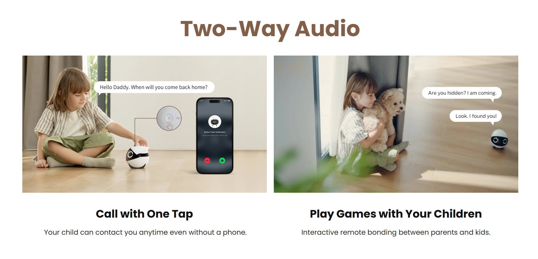 Tính năng âm thanh hai chiều cho phép bạn trò chuyện trực tiếp với gia đình. Điểm nhấn độc đáo là nút gọi một chạm trên thân máy, giúp trẻ nhỏ có thể liên lạc ngay lập tức với cha mẹ mà không cần dùng đến điện thoại di động.