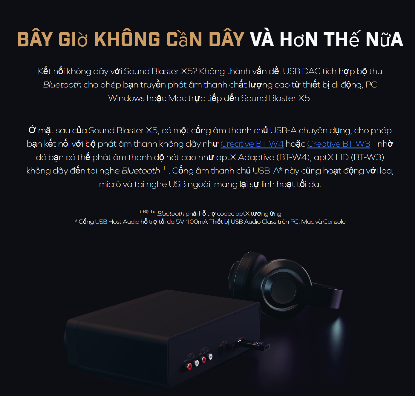 X5 tích hợp công nghệ Sound Blaster Acoustic Engine, cho phép người dùng tùy chỉnh sâu dải tần, âm thanh vòm và các hiệu ứng âm thanh khác. Với DAC 130 dB và ADC 114 dB (cho Line-in và Mic-in), sản phẩm này cũng là một công cụ lý tưởng cho các nhà sáng tạo nội dung cần thu âm chất lượng cao.