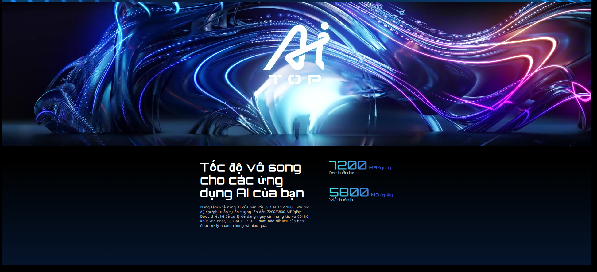 Tốc độ đọc/ghi cực nhanh: Với tốc độ đọc tuần tự lên đến 7,200 MB/s và tốc độ ghi tuần tự lên đến 5,800 MB/s, AI TOP 100E giảm thiểu tối đa thời gian chờ đợi. Điều này đặc biệt hữu ích cho việc tải dữ liệu lớn, khởi động các ứng dụng nặng và xử lý các tập tin dung lượng cao một cách nhanh chóng.