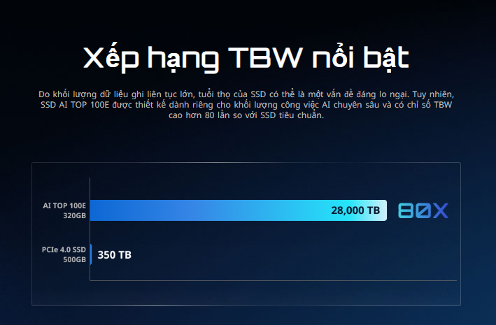 Tối ưu hóa cho AI và các tác vụ chuyên sâu: Điểm nổi bật của AI TOP 100E là khả năng mở rộng bộ nhớ ảo cho các mô hình AI phức tạp, giúp tăng tốc quá trình đào tạo và xử lý dữ liệu. Sản phẩm có chỉ số TBW (Terabytes Written) vượt trội, đảm bảo độ bền cao khi phải chịu tải liên tục từ các tác vụ học máy (machine learning).