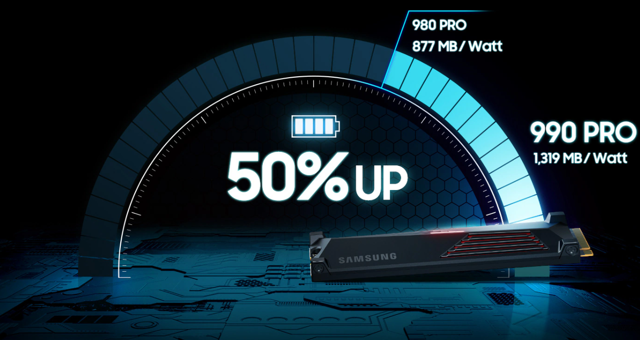 SSD Samsung 990 PRO được cải tiến về hiệu suất năng lượng, cung cấp hiệu suất trên mỗi Watt điện năng tiêu thụ cao hơn đáng kể so với thế hệ trước. Sản phẩm sử dụng V-NAND thế hệ mới nhất và có độ bền đáng tin cậy lên đến 1.200 TBW (Terabytes Written) cho bản 2TB, khẳng định chất lượng và độ tin cậy cao của Samsung.