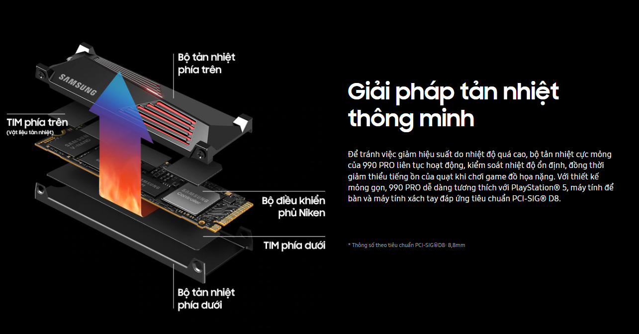 Phiên bản Heatsink của SSD Samsung 990 PRO được trang bị bộ tản nhiệt kim loại mỏng, giúp kiểm soát nhiệt độ hiệu quả. Điều này ngăn ngừa hiện tượng quá nhiệt (Thermal Throttling), đảm bảo ổ cứng luôn duy trì hiệu suất tốc độ cao và ổn định trong các tình huống tải nặng kéo dài, cực kỳ quan trọng đối với các hệ thống gaming và PS5.