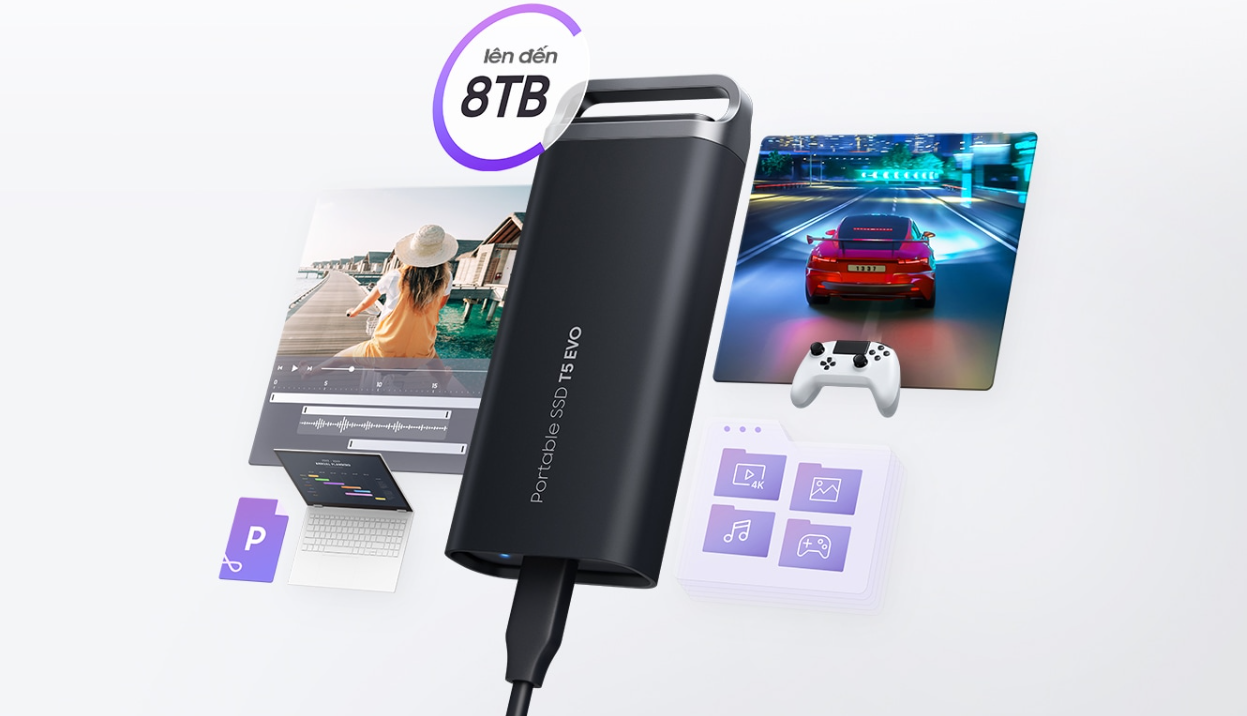 Ổ cứng di động SSD Samsung T5 EVO USB 3.2 là giải pháp lưu trữ lý tưởng cho những người cần dung lượng lớn (2TB, 4TB) và hiệu suất ổn định trong một thiết kế nhỏ gọn, bền bỉ. Chiếc SSD di động này sử dụng giao diện USB 3.2 Gen 1, đạt tốc độ đọc/ghi tuần tự lên đến 460 MB/s, nhanh hơn nhiều lần so với ổ HDD truyền thống. Với khả năng bảo vệ dữ liệu chống sốc và tương thích đa thiết bị (PC, Mac, Android, Console), Samsung T5 EVO là người bạn đồng hành đáng tin cậy cho công việc và giải trí di động.