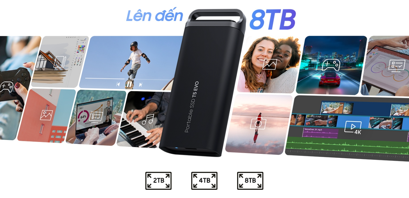 Điểm mạnh vượt trội của Ổ cứng di động SSD Samsung T5 EVO là khả năng cung cấp dung lượng lớn lên đến 4TB. Dung lượng này đủ để lưu trữ hàng ngàn bức ảnh RAW, video 4K, hay thư viện game đồ sộ, đáp ứng nhu cầu của các nhà sáng tạo nội dung và người dùng có nhiều dữ liệu cần mang theo.