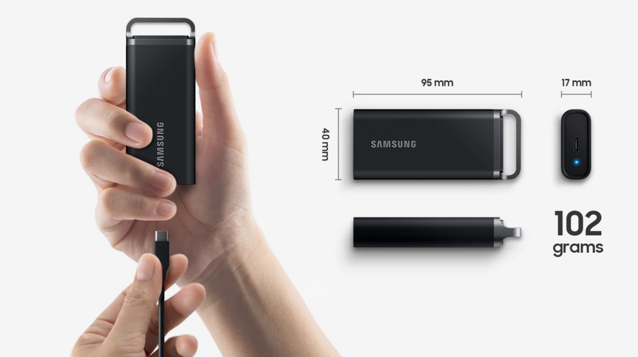 Samsung T5 EVO được thiết kế với lớp vỏ ngoài chắc chắn, giúp bảo vệ dữ liệu khỏi va đập và rơi rớt (chịu được độ cao lên đến 2 mét). Hình dáng nhỏ gọn cùng vòng móc tiện lợi giúp bạn dễ dàng mang theo chiếc SSD di động này một cách an toàn và thời trang, khẳng định sự bền bỉ của một sản phẩm chất lượng cao.