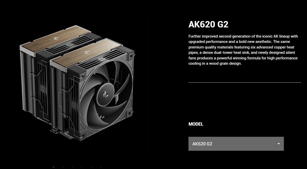 Tản nhiệt khí DeepCool AK620 G2 là sự kết hợp hoàn hảo giữa thẩm mỹ cổ điển và công nghệ làm mát hiện đại cho các hệ thống máy tính cao cấp. Với điểm nhấn là nắp đậy vân gỗ (Wood Grain) sang trọng, sản phẩm mang lại vẻ ngoài độc đáo, thoát khỏi thiết kế công nghiệp thông thường. Tản nhiệt khí DeepCool AK620 G2 được xây dựng trên cấu trúc tháp đôi mạnh mẽ, đảm bảo khả năng giải nhiệt tối ưu cho những vi xử lý đa nhân mạnh mẽ nhất hiện nay.