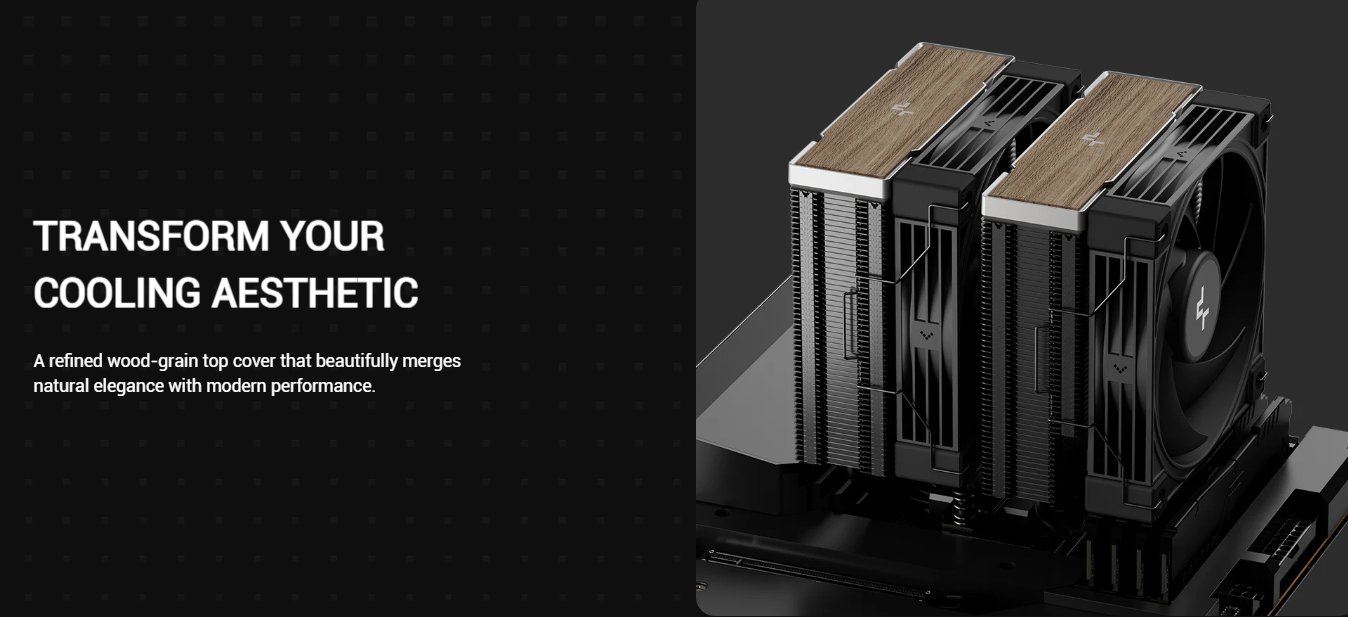 Sự khác biệt lớn nhất của Tản nhiệt khí DeepCool AK620 G2 chính là phần nắp đậy phía trên được làm bằng vân gỗ tự nhiên, tạo cảm giác ấm cúng và tinh tế. Thiết kế này đặc biệt phù hợp cho các bộ PC theo phong cách tối giản, Scandinavian hoặc những người dùng muốn tạo điểm nhấn khác biệt hoàn toàn với hệ thống LED RGB rực rỡ truyền thống.