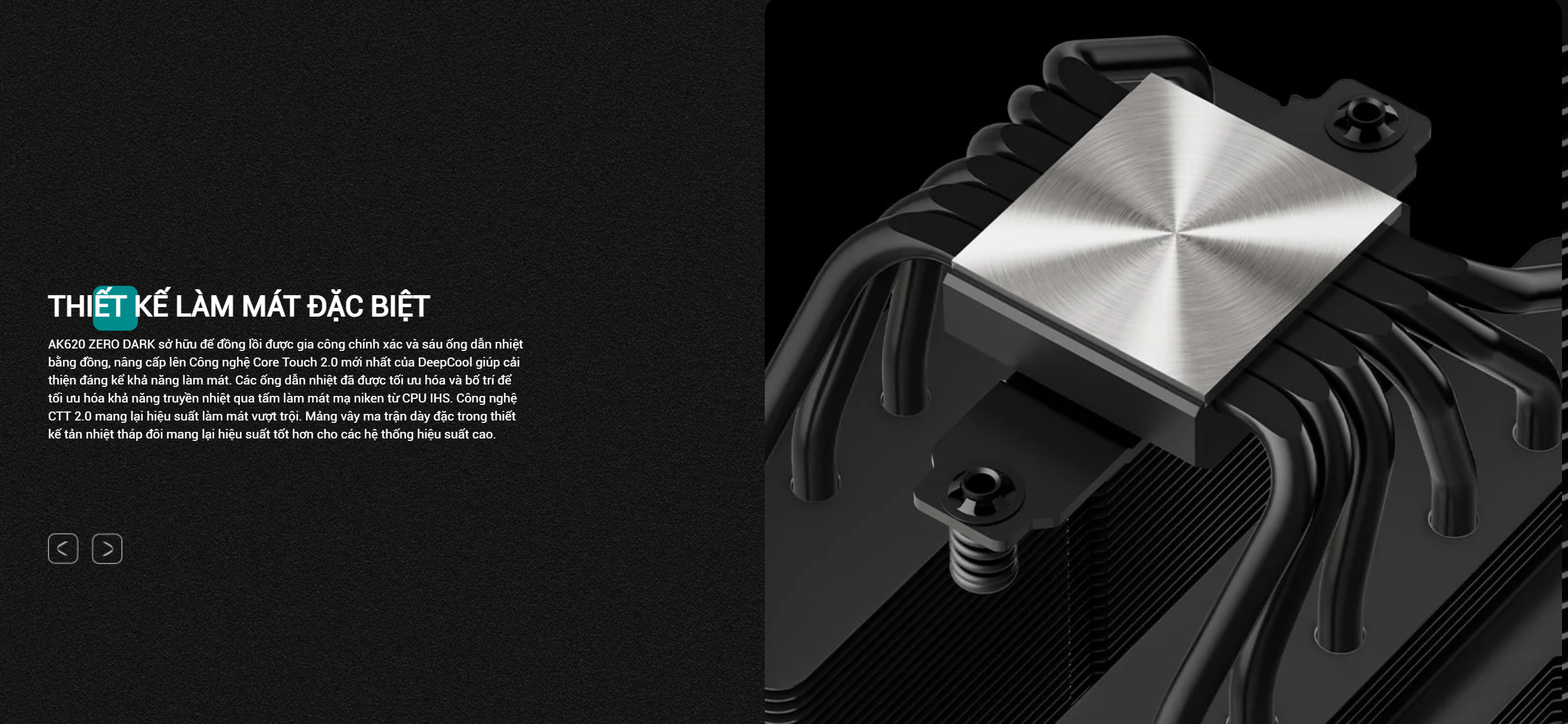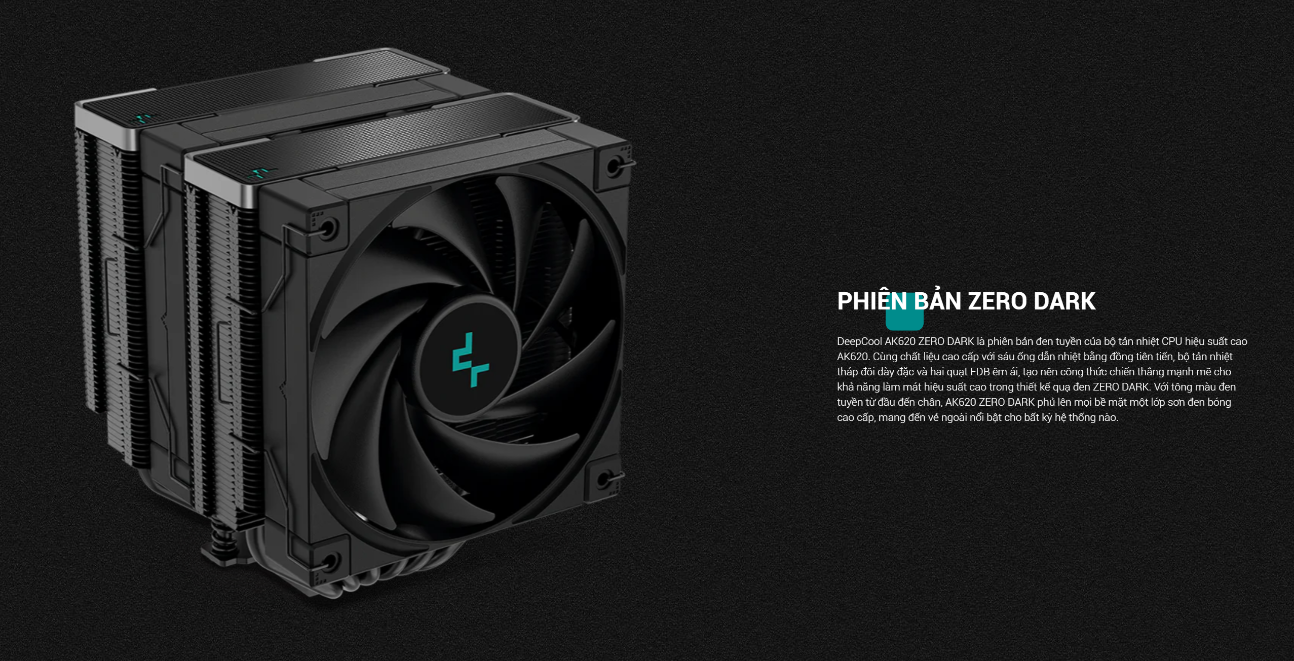 Thiết kế đen tuyền độc đáo: AK620 ZERO DARK nổi bật với lớp sơn đen lì toàn bộ, từ các lá tản nhiệt, ống đồng cho đến quạt. Thiết kế này mang lại vẻ ngoài mạnh mẽ, huyền bí, phù hợp với những người dùng yêu thích sự tối giản, sang trọng và muốn xây dựng một cỗ máy PC có tông màu đen đồng nhất.