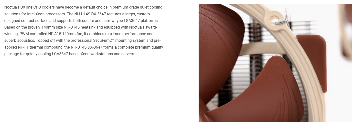 Tản nhiệt khí Noctua NH-U14S DX-3647 là dòng tản nhiệt khí chuyên dụng thuộc dòng DX của Noctua, được thiết kế đặc biệt cho các hệ thống máy trạm và máy chủ sử dụng bộ vi xử lý Intel Xeon trên socket LGA3647. Với diện tích bề mặt tháp 140mm rộng lớn và quạt NF-A15 hiệu suất cao, NH-U14S DX-3647 mang lại khả năng làm mát vượt trội, giúp thay thế hoàn hảo cho các bộ tản nhiệt stock ồn ào trong các hệ thống Workstation và Server.