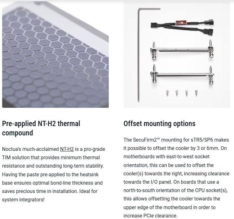 Noctua đã bôi sẵn lớp keo tản nhiệt NT-H2 (phiên bản cải tiến có hiệu suất cao hơn NT-H1) trên mặt đế theo dạng các điểm chấm tối ưu. Bạn chỉ cần đặt tản nhiệt lên và siết vít, tiết kiệm thời gian và đảm bảo hiệu quả giải nhiệt cao nhất ngay lập tức.