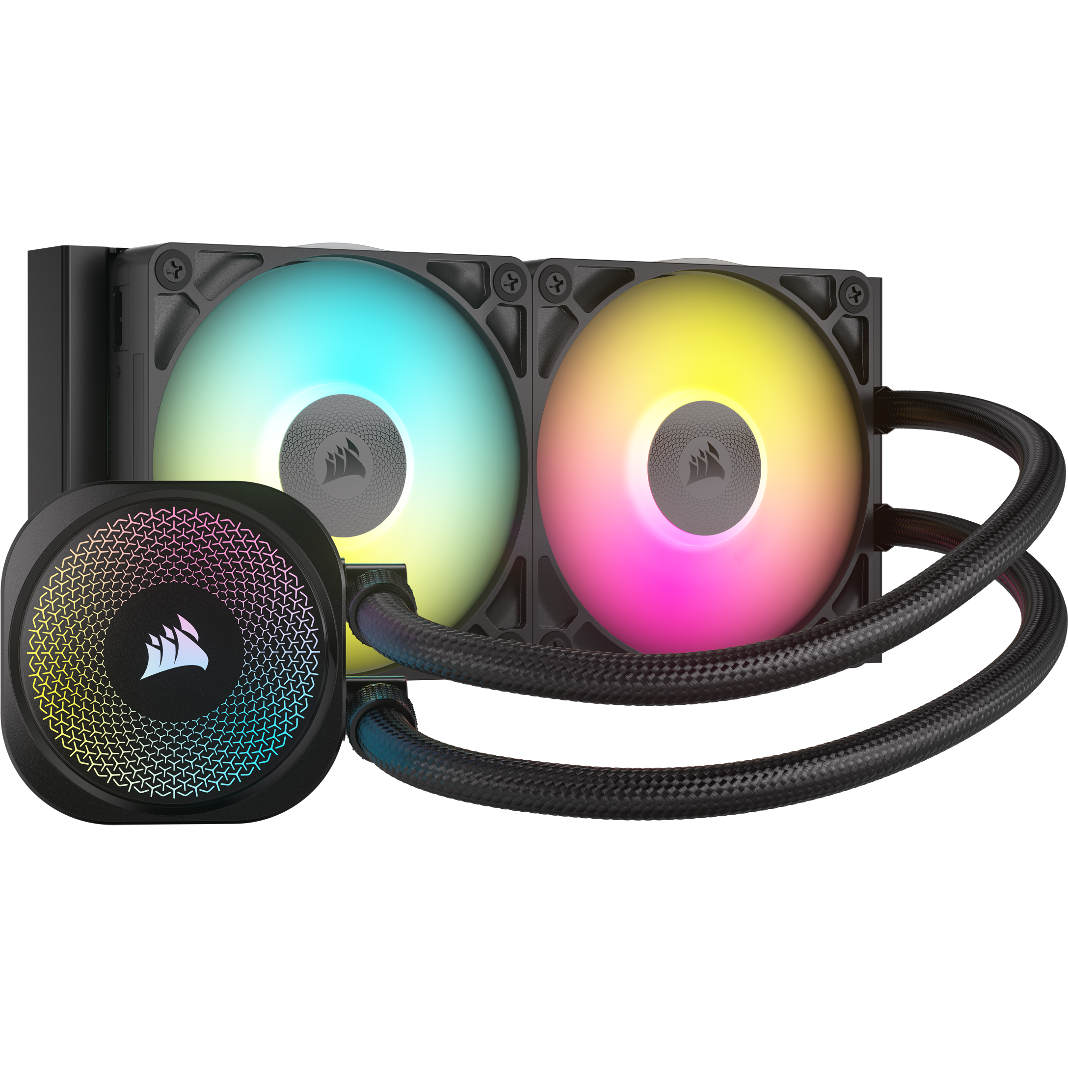 Hai quạt 120mm đi kèm tích hợp đèn RGB sống động, có thể tùy chỉnh dễ dàng qua phần mềm iCUE. Thay vì sử dụng PWM truyền thống, việc điều khiển quạt được thực hiện bằng phương pháp Digital (kỹ thuật số) thông qua giao thức iCUE LINK, mang lại khả năng điều chỉnh tốc độ chính xác trong dải 300 - 2100 RPM ±10%, tối ưu hóa giữa hiệu năng và độ ồn.