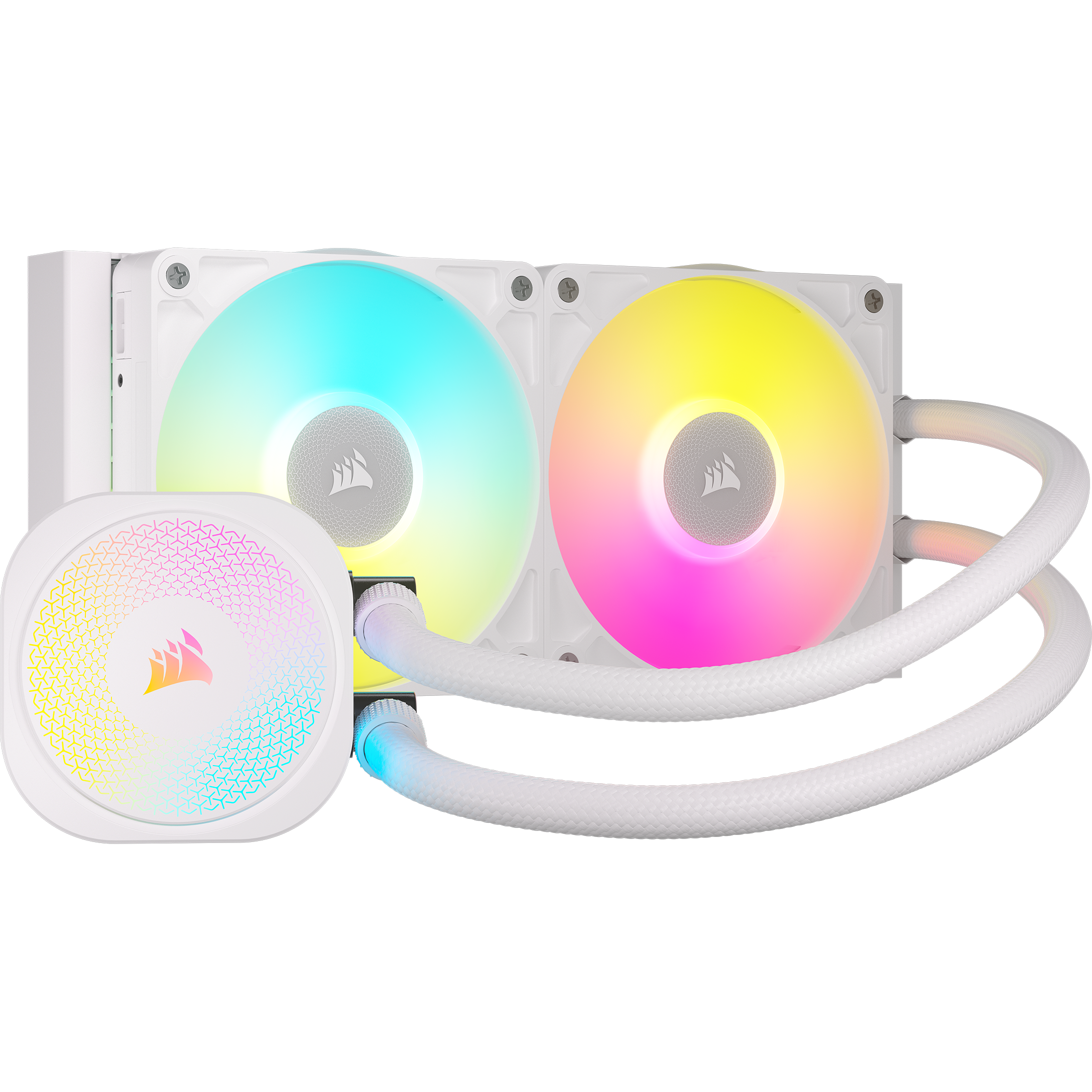 Hai quạt 120mm đi kèm tích hợp đèn RGB sống động, có thể tùy chỉnh dễ dàng qua phần mềm iCUE. Thay vì sử dụng PWM truyền thống, việc điều khiển quạt được thực hiện bằng phương pháp Digital (kỹ thuật số) thông qua giao thức iCUE LINK, mang lại khả năng điều chỉnh tốc độ chính xác trong dải 300 - 2100 RPM ±10%, tối ưu hóa giữa hiệu năng và độ ồn.