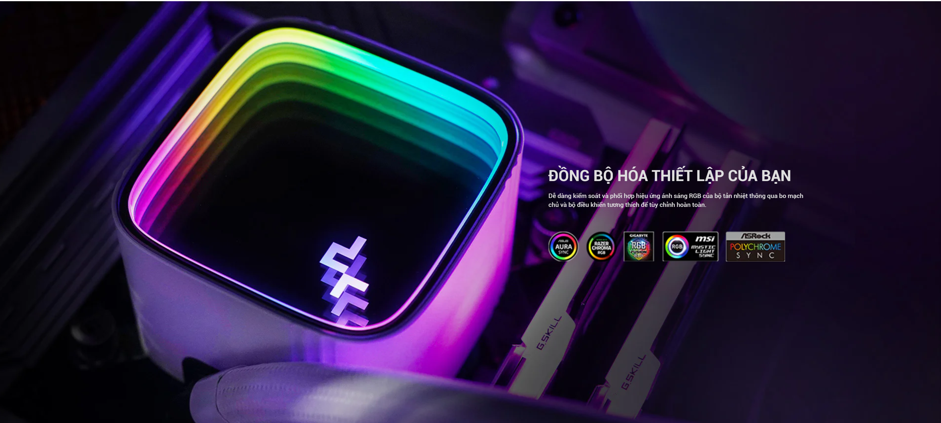 Hiệu ứng ánh sáng ARGB đẹp mắt: Hệ thống tản nhiệt được trang bị đèn LED ARGB có thể tùy chỉnh ở cả block bơm và quạt. Với đầu cắm 3-pin (+5V-D-G), bạn có thể dễ dàng đồng bộ ánh sáng với các linh kiện ARGB khác trong hệ thống, tạo nên một không gian PC đầy màu sắc và phong cách.