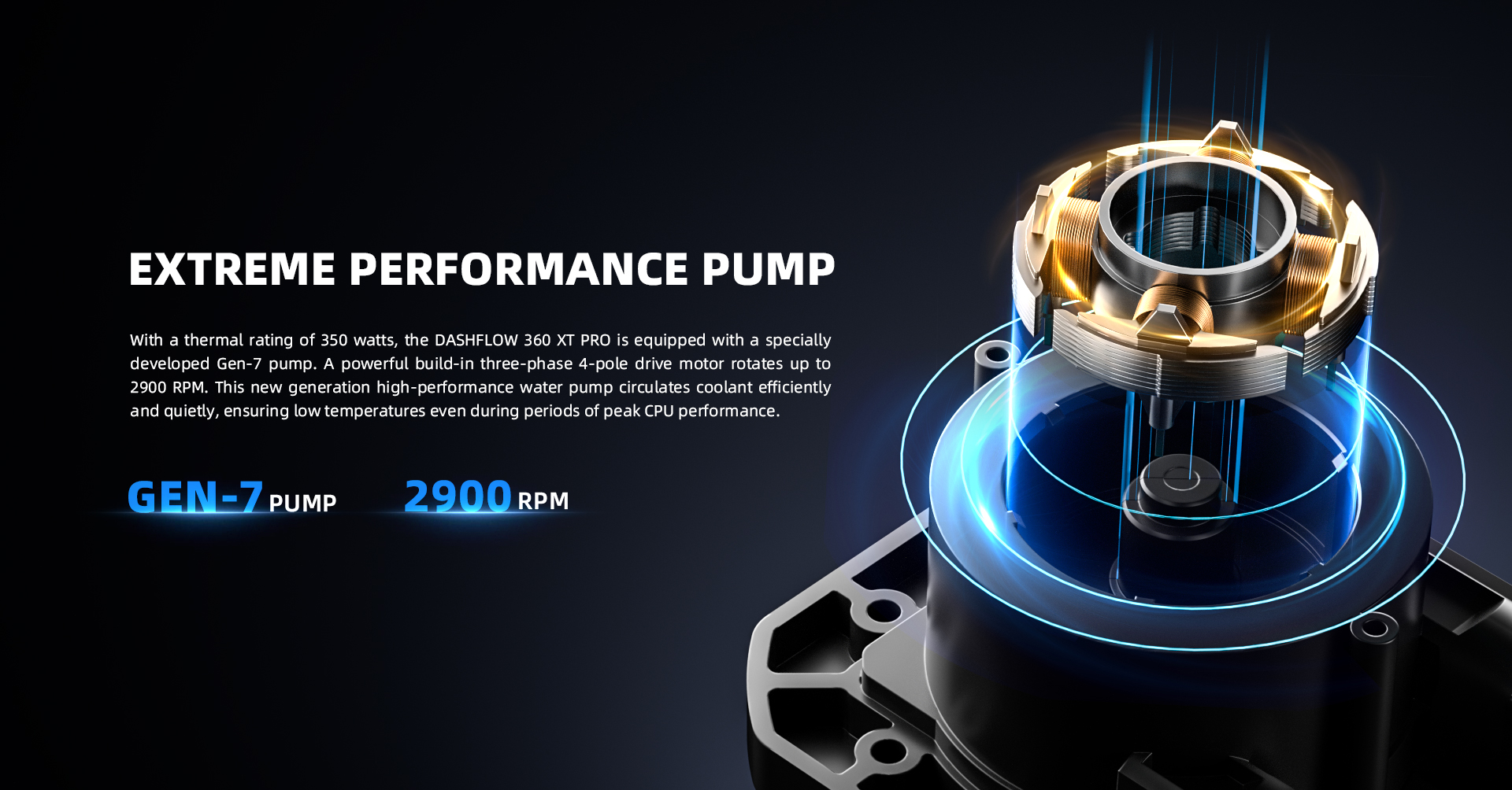 Sản phẩm sở hữu cụm Waterblock kích thước lớn (94x90x62mm) tích hợp công nghệ tản nhiệt kép: Bơm Ceramic 2900RPM: Trục gốm (Ceramic Bearing) siêu bền giúp bơm vận hành mạnh mẽ, ổn định với tuổi thọ lên tới 50.000 giờ nhưng vẫn cực kỳ yên tĩnh (≤25dB). Quạt Pump tích hợp (70mm): Một quạt phụ 70mm được trang bị ngay trên cụm Pump giúp thổi luồng khí mát trực tiếp vào khu vực dàn phase điện (VRM) và RAM, giúp bo mạch chủ luôn duy trì nhiệt độ ổn định.