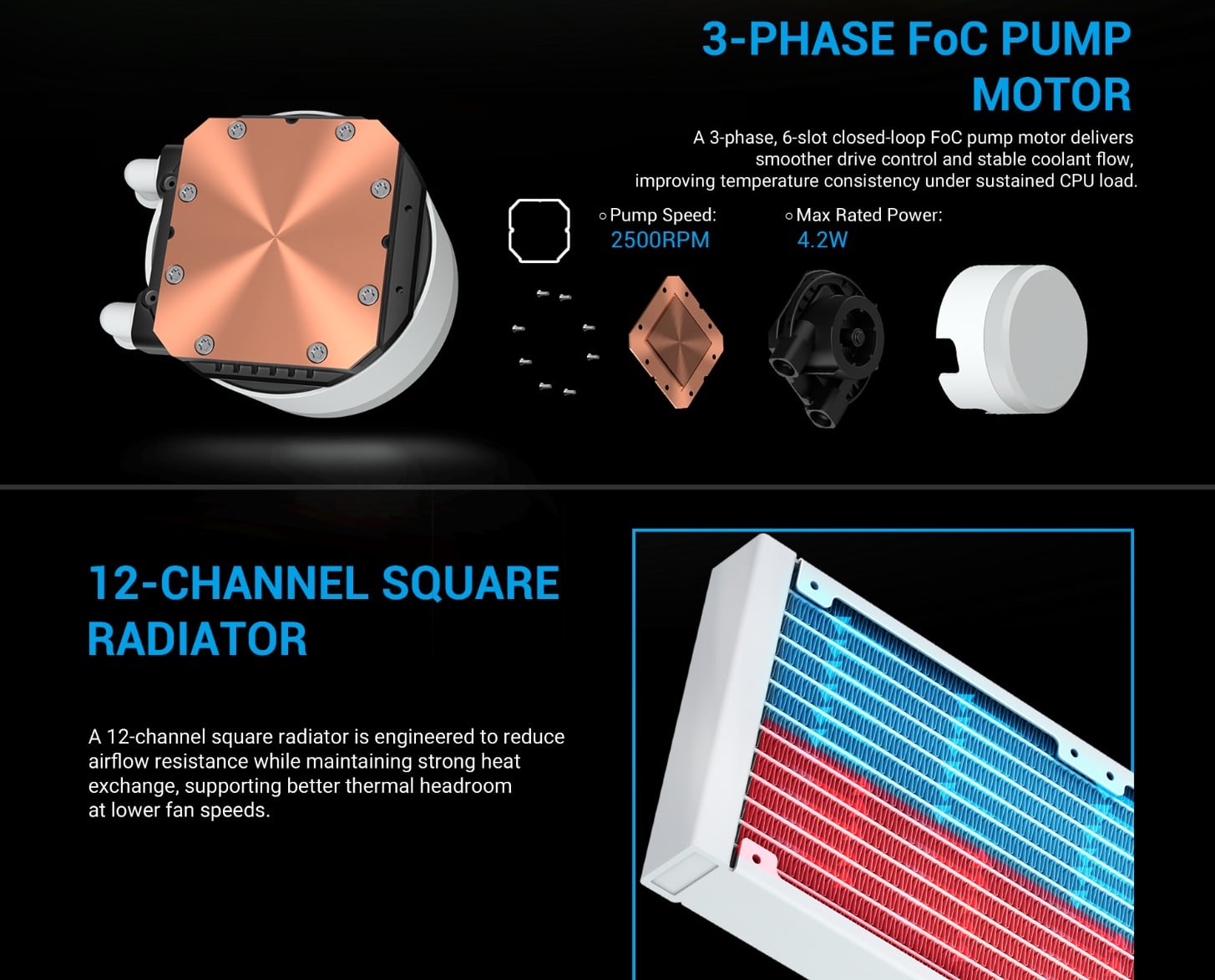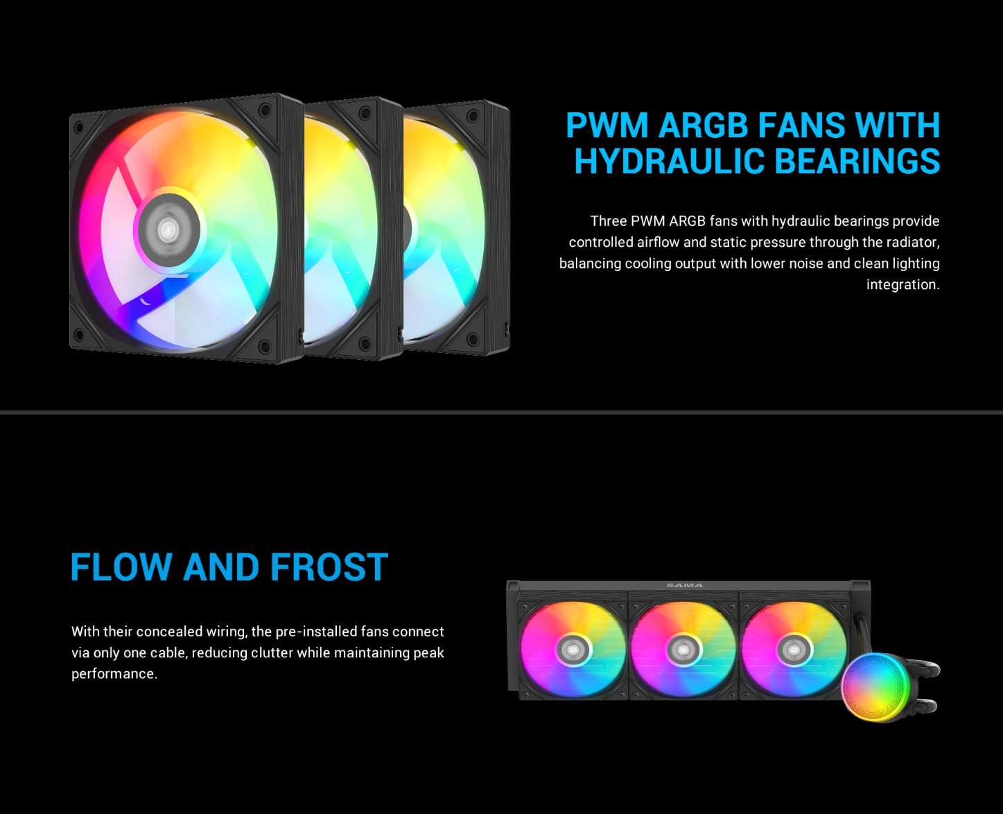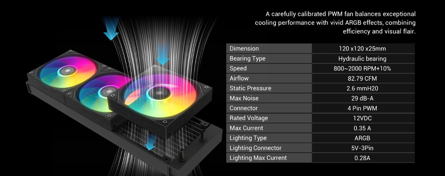 Đi kèm tản nhiệt là 3 quạt 120mm hiệu suất cao với lưu lượng gió lên tới 83 CFM – mức thông số ấn tượng giúp xuyên thấu qua các lá nhôm của Radiator. Quạt sử dụng vòng bi Hydraulic Bearing giúp vận hành êm ái ở dải tốc độ từ 800 đến 2000 RPM. Đặc biệt, hệ thống dây kết nối được thiết kế tối giản, giúp bạn quản lý dây cáp gọn gàng hơn trong quá trình lắp đặt.