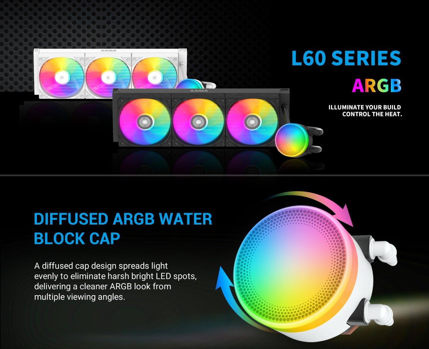 Sama L60 là dòng tản nhiệt nước AIO 360mm được thiết kế để mang lại sự cân bằng hoàn hảo giữa tính thẩm mỹ hiện đại và hiệu suất giải nhiệt bền bỉ. Với khối Water Block có khả năng khuếch tán ánh sáng ARGB độc đáo cùng hệ thống bơm 3 pha tiên tiến, L60 không chỉ giúp bộ vi xử lý của bạn luôn mát mẻ dưới mọi áp lực mà còn biến không gian bên trong thùng máy thành một bữa tiệc ánh sáng thực thụ.
