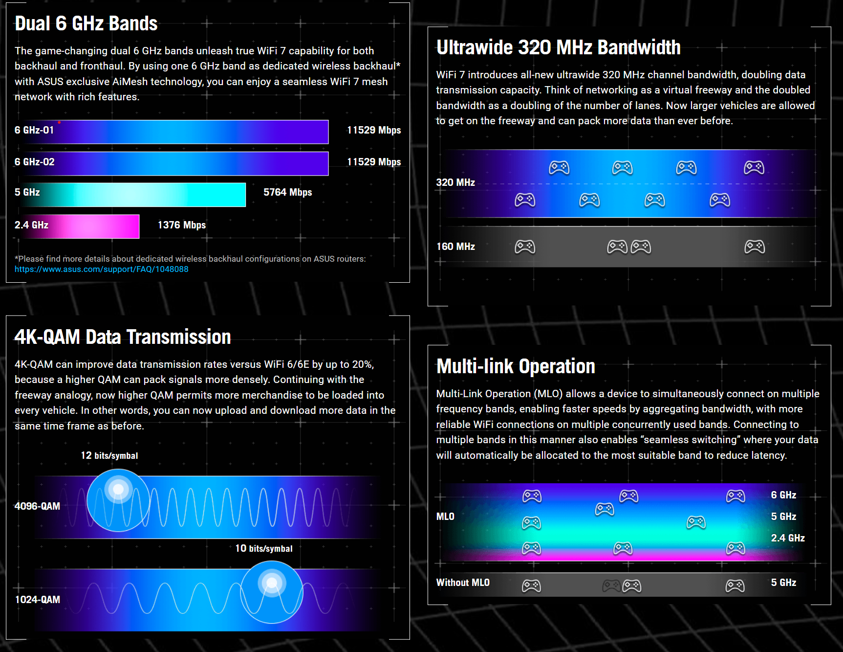 - Những người đam mê công nghệ mới nhất: GT-BE98 Pro là một trong những router đầu tiên hỗ trợ chuẩn WiFi 7 tiên tiến, mang đến trải nghiệm công nghệ hàng đầu.