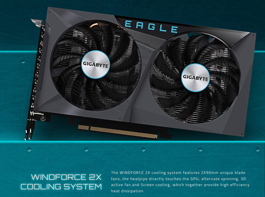 VGA RTX 3050 EAGLE 8G trang bị hệ thống làm mát WINDFORCE của GIGABYTE (thường là 2 quạt), với công nghệ quay luân phiên (Alternate Spinning) giúp tối ưu hóa luồng khí và giảm tiếng ồn. Hệ thống tản nhiệt này đảm bảo khả năng tản nhiệt hiệu quả, giữ cho nhiệt độ thấp để duy trì hiệu suất ổn định và tuổi thọ của linh kiện.