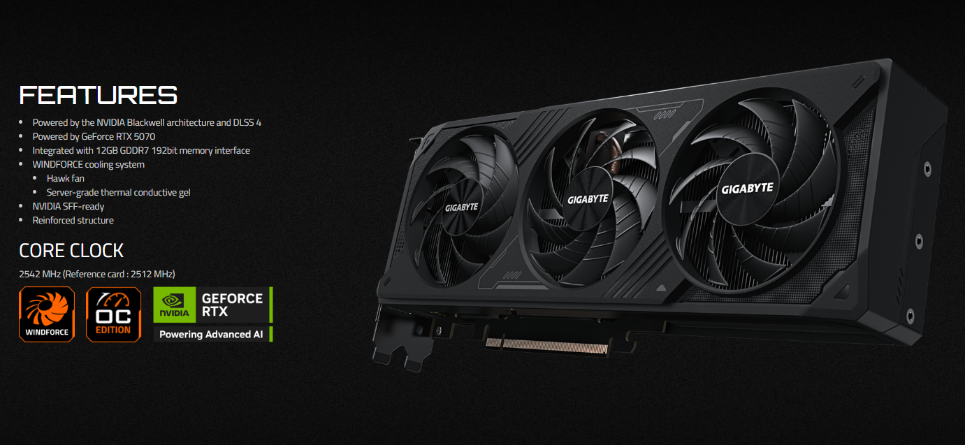 Model: GIGABYTE GeForce RTX 5070 WINDFORCE OC SFF 12G (GV-N5070WF3OC-12GD)