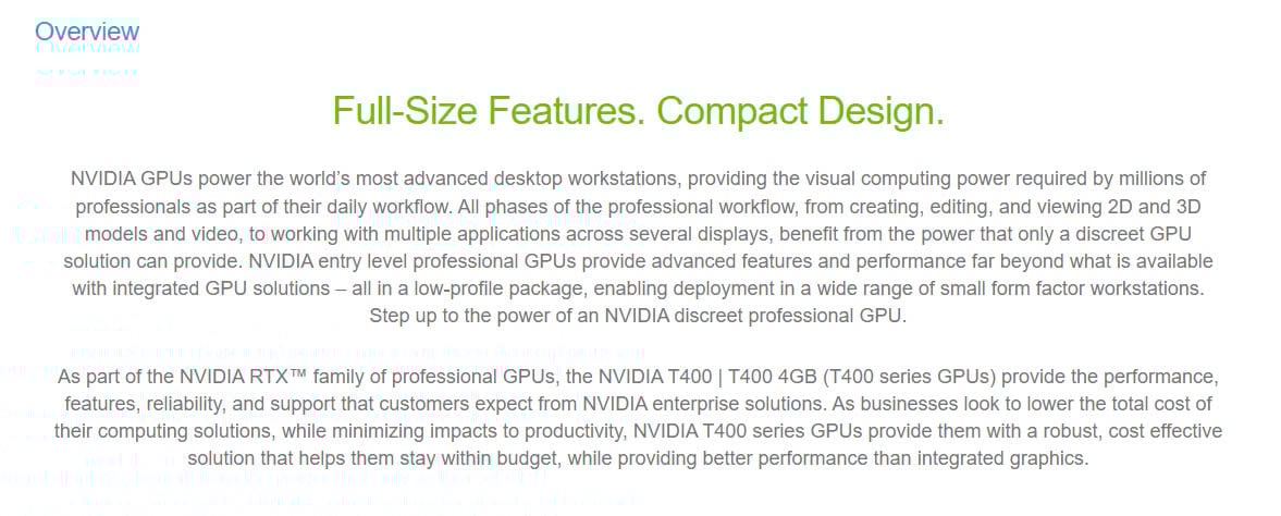 VGA LEADTEK NVIDIA T400 4GB là một công cụ hiệu quả cho các công việc đồ họa cơ bản, mang lại hiệu suất tốt trong một thiết kế nhỏ gọn và siêu tiết kiệm điện năng. Đây là lựa chọn lý tưởng cho các ứng dụng chuyên nghiệp đòi hỏi độ tin cậy trong không gian làm việc hạn chế và các ứng dụng cơ bản.
