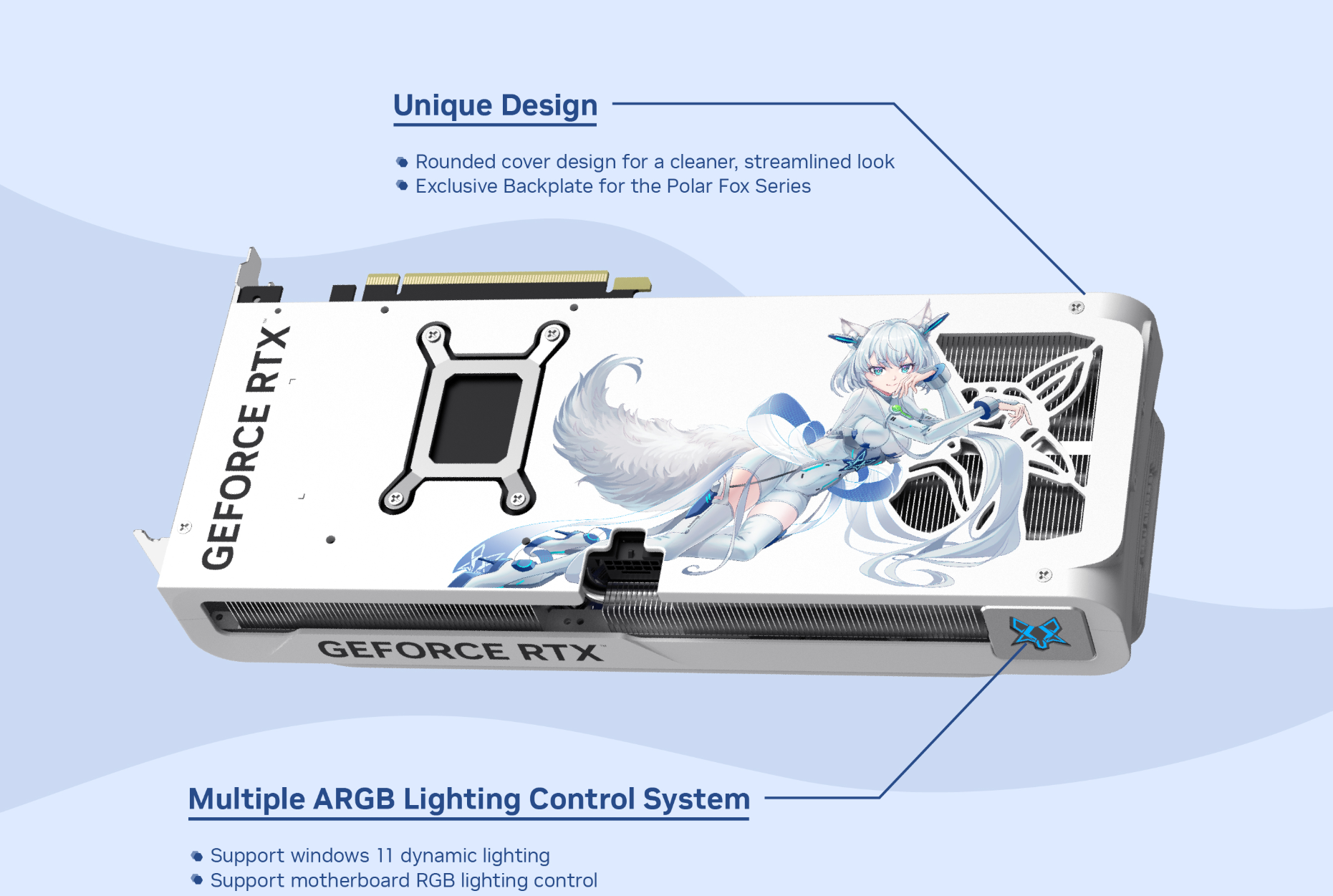 Thiết kế độc đáo với Backplate và RGB: Card được trang bị Backplate độc quyền của dòng Polar Fox, không chỉ tăng tính thẩm mỹ mà còn giúp bảo vệ PCB. Khả năng hỗ trợ Windows 11 dynamic lighting và điều khiển RGB lighting của bo mạch chủ giúp bạn dễ dàng đồng bộ hóa hiệu ứng ánh sáng, tạo nên một hệ thống PC đầy cá tính và ấn tượng.