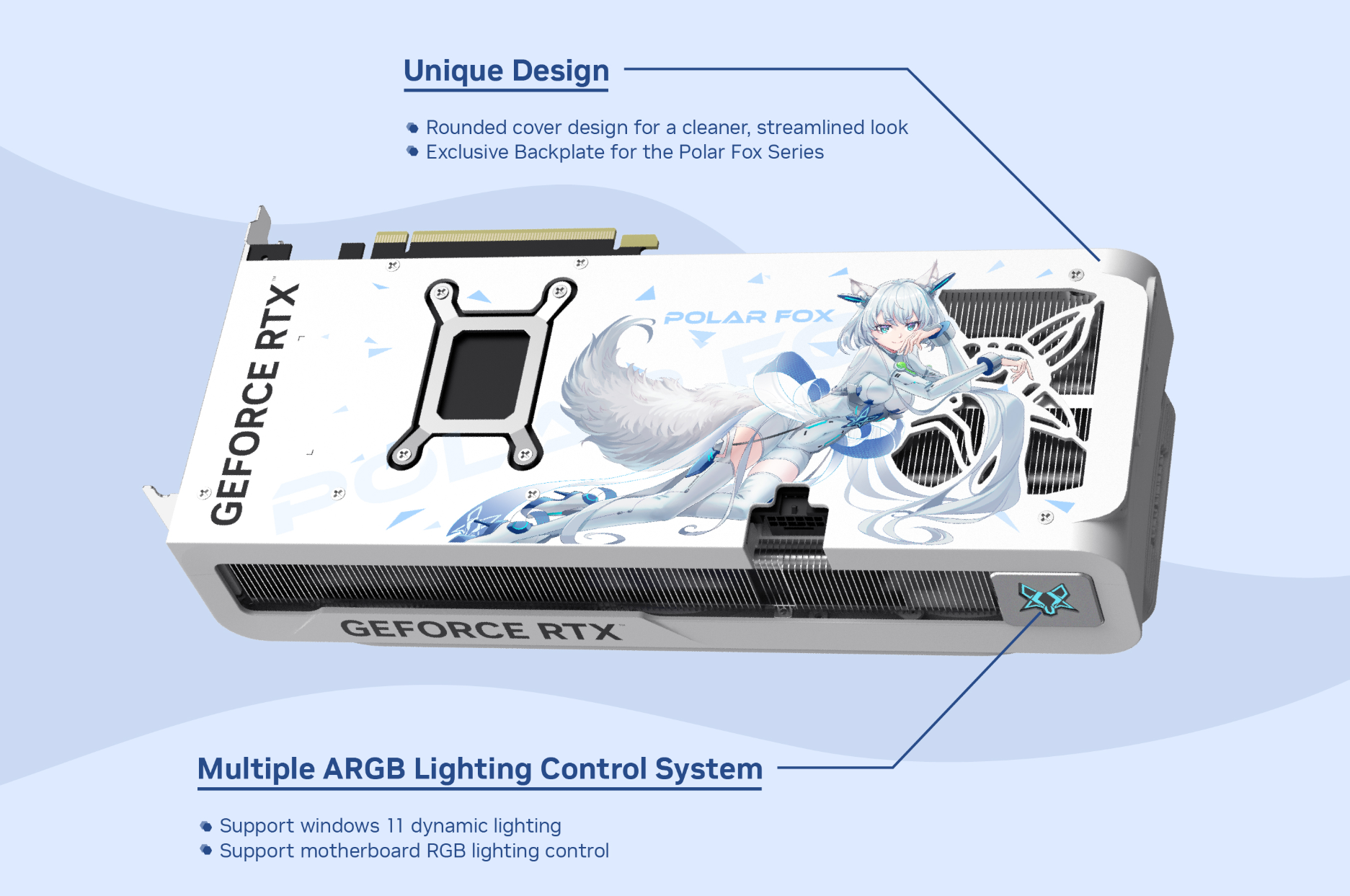 Thiết kế độc đáo với Backplate và RGB: Card được trang bị Backplate độc quyền của dòng Polar Fox, không chỉ tăng tính thẩm mỹ mà còn giúp bảo vệ PCB. Khả năng hỗ trợ Windows 11 dynamic lighting và điều khiển RGB lighting của bo mạch chủ giúp bạn dễ dàng đồng bộ hóa hiệu ứng ánh sáng, tạo nên một hệ thống PC đầy cá tính và ấn tượng.