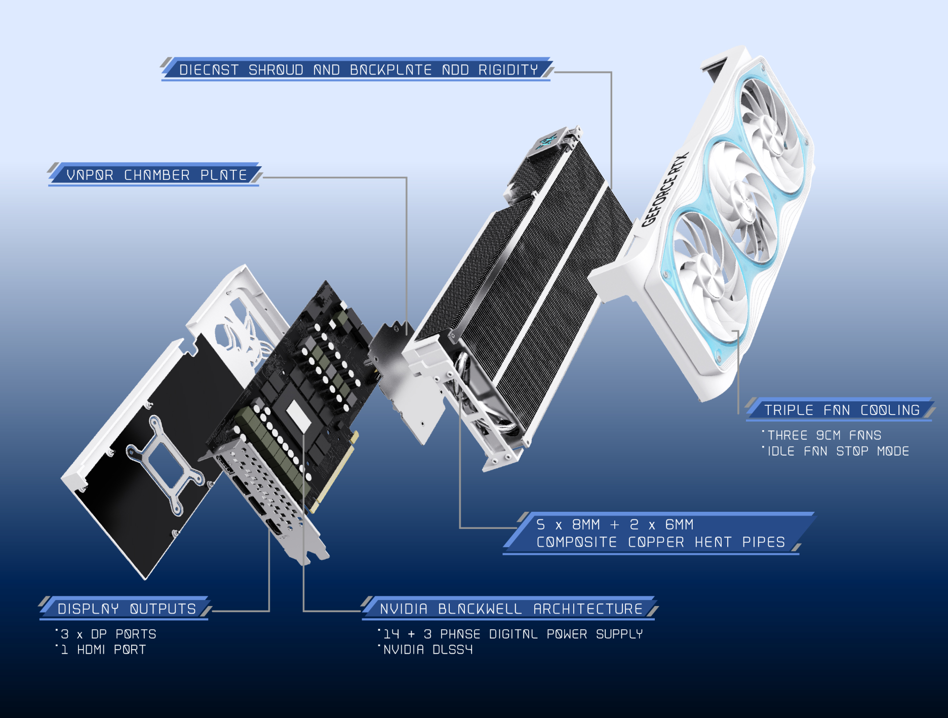 Công nghệ tản nhiệt tiên tiến: Card được trang bị hệ thống tản nhiệt đột phá với VC Heatsink (tản nhiệt buồng hơi) và Triple Cooler (3 quạt). Công nghệ tản nhiệt buồng hơi giúp phân tán nhiệt hiệu quả hơn, kết hợp với hệ thống quạt thông minh, duy trì nhiệt độ ổn định ngay cả khi hoạt động ở mức tải cao. Chức năng An-stop function at idle state giúp quạt ngừng quay khi tải thấp, giảm tiếng ồn và tiết kiệm năng lượng.
