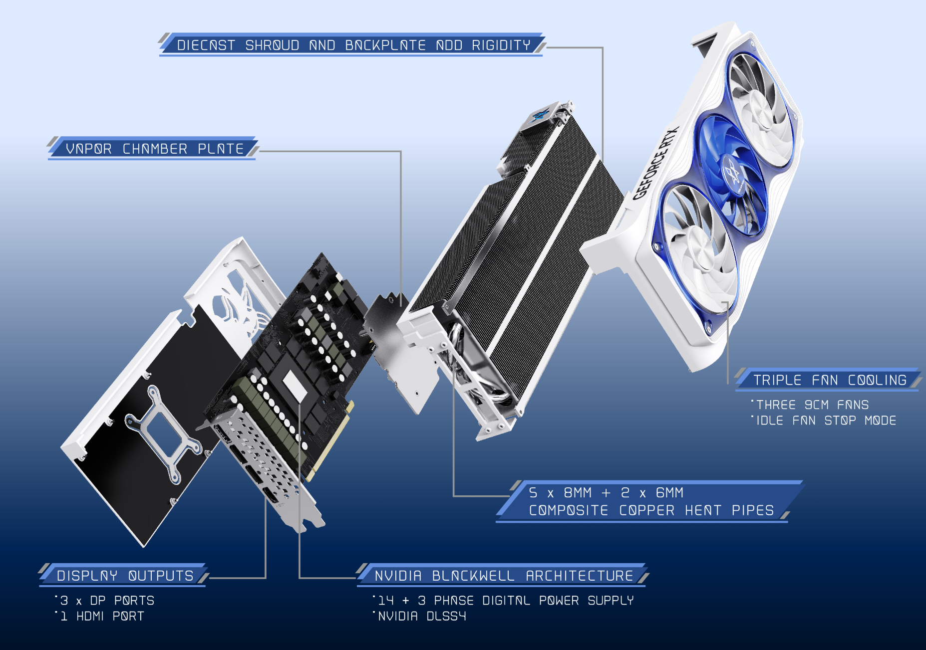 Công nghệ tản nhiệt tiên tiến: Card được trang bị hệ thống tản nhiệt đột phá với VC Heatsink (tản nhiệt buồng hơi) và Triple Cooler (3 quạt). Công nghệ tản nhiệt buồng hơi giúp phân tán nhiệt hiệu quả hơn, kết hợp với hệ thống quạt thông minh, duy trì nhiệt độ ổn định ngay cả khi hoạt động ở mức tải cao. Chức năng An-stop function at idle state giúp quạt ngừng quay khi tải thấp, giảm tiếng ồn và tiết kiệm năng lượng.