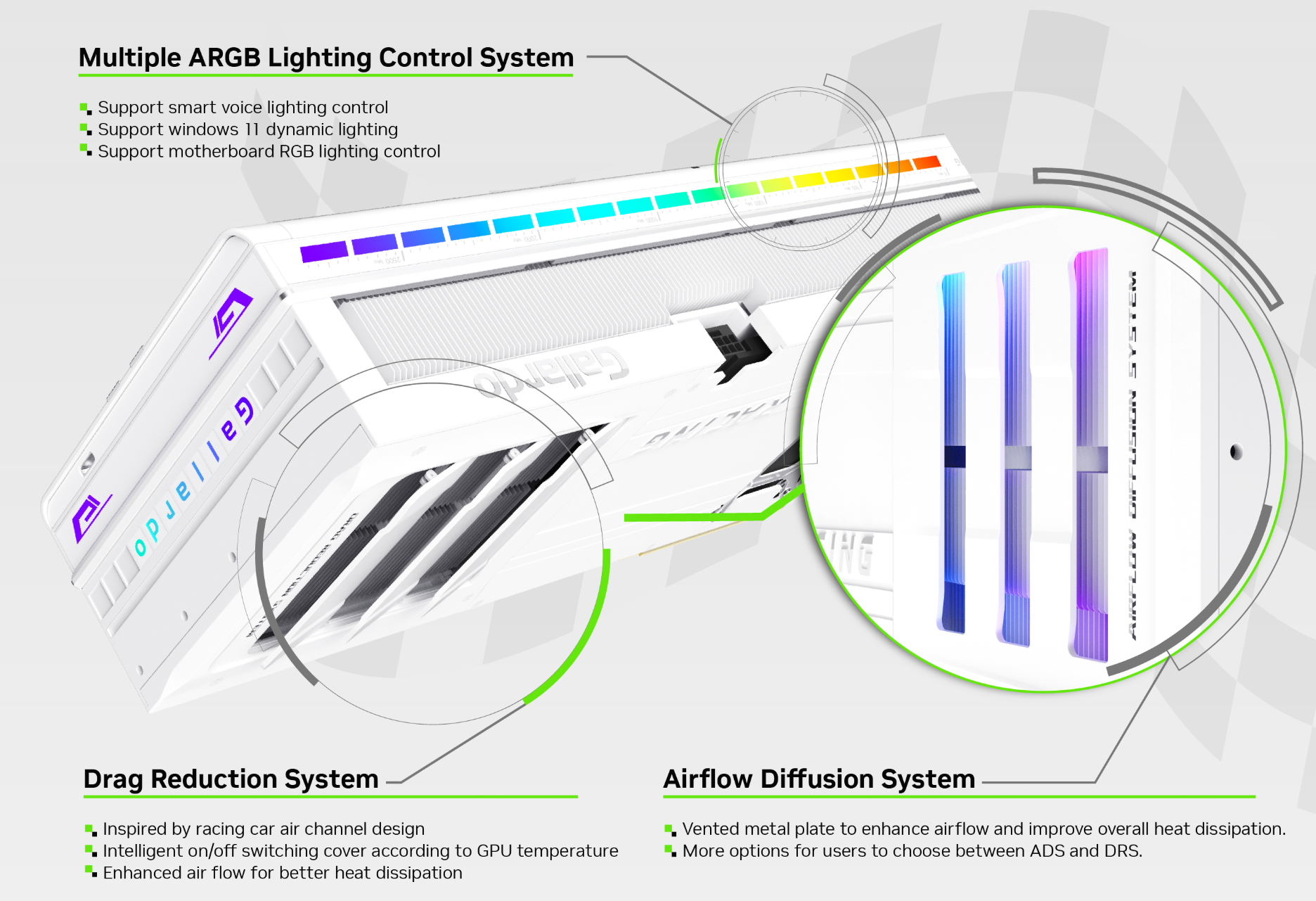 Thiết kế màu trắng độc đáo và hỗ trợ RGB: Với tông màu trắng chủ đạo, chiếc card này không chỉ là một linh kiện hiệu suất cao mà còn là một điểm nhấn thẩm mỹ cho dàn PC của bạn. Khả năng hỗ trợ Windows 11 dynamic lighting, điều khiển RGB lighting của bo mạch chủ, và đặc biệt là tính năng smart voice lighting control độc quyền, cho phép bạn điều chỉnh hiệu ứng ánh sáng bằng giọng nói, tạo nên một hệ thống PC đầy cá tính và hiện đại.