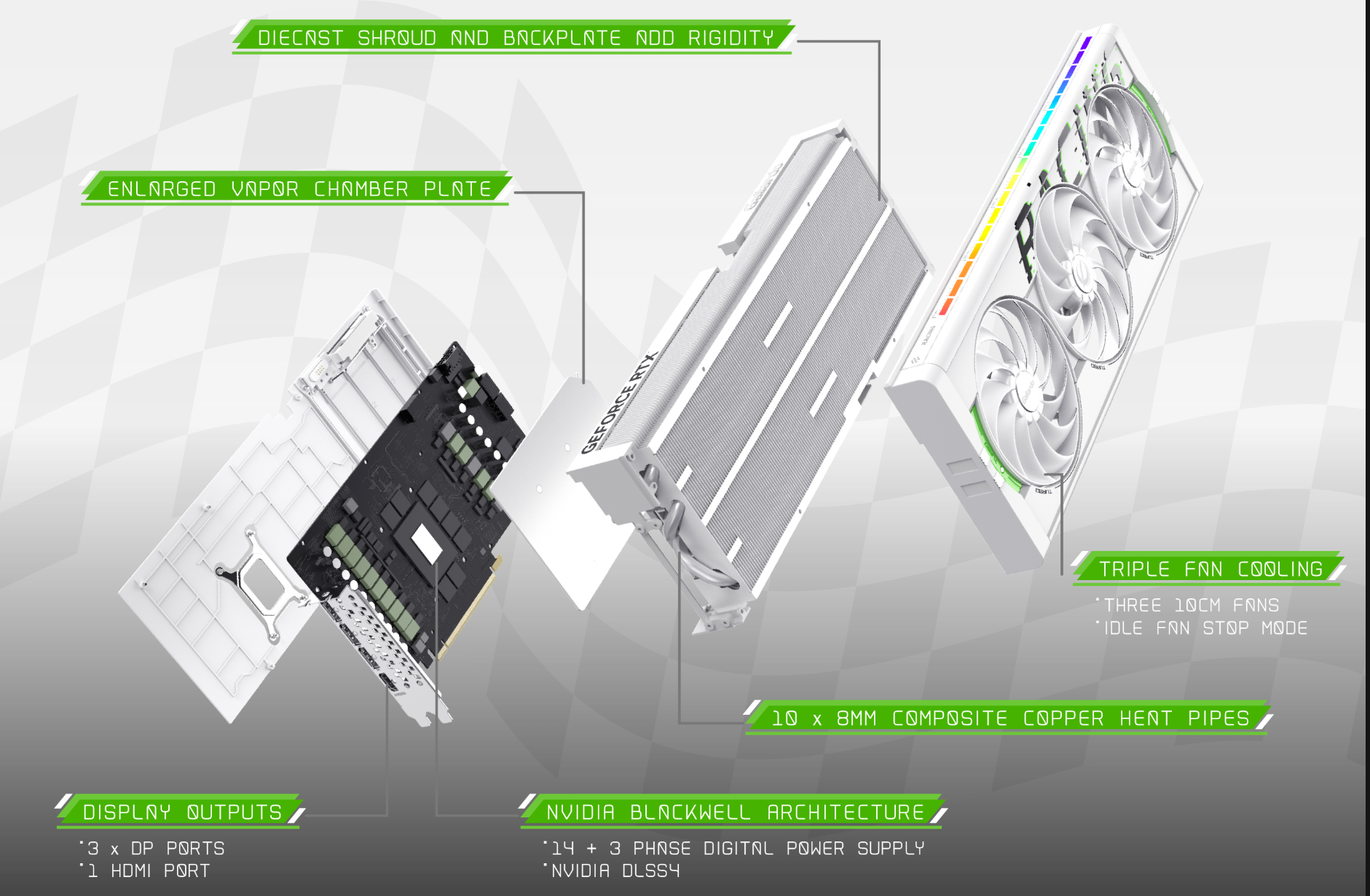 Công nghệ tản nhiệt tiên tiến: Card được trang bị hệ thống tản nhiệt đột phá với VC Heatsink và Triple Cooler (3 quạt). Công nghệ tản nhiệt buồng hơi (Vapor Chamber) giúp phân tán nhiệt hiệu quả hơn, kết hợp với hệ thống quạt thông minh, duy trì nhiệt độ ổn định ngay cả khi hoạt động ở mức tải cao. Tính năng Airflow Diffusion System tối ưu hóa luồng không khí, giúp làm mát toàn diện. Chức năng An-stop function at idle state giúp quạt ngừng quay khi tải thấp, giảm tiếng ồn và tiết kiệm năng lượng.