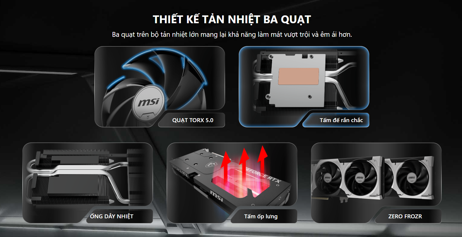 Với Kích thước card 304 x 121 x 44 mm, card được trang bị hệ thống tản nhiệt 3 quạt của dòng VENTUS, nổi tiếng với thiết kế tối giản nhưng hiệu quả. Hệ thống này đảm bảo khả năng làm mát vượt trội, duy trì nhiệt độ ổn định ngay cả khi hoạt động ở mức tải cao và trong thời gian dài, giúp kéo dài tuổi thọ và giữ hiệu suất tối đa.