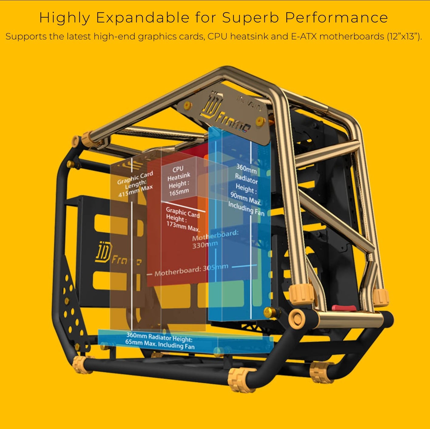 - Không Gian Rộng Rãi & Linh Hoạt Cho Các Cấu Hình E-ATX Dù mang trong mình thiết kế nghệ thuật, D-Frame 2.0 vẫn là một chiếc vỏ case cực kỳ đa năng. Không gian bên trong vô cùng rộng rãi, hỗ trợ các bo mạch chủ kích thước lớn nhất lên tới E-ATX 12" x 13", card đồ họa dài tới 415mm và tản nhiệt khí CPU cao 165mm. Với 8 khe PCI-E và các khay gắn ổ cứng, quạt tản nhiệt đa chức năng, chiếc case này cung cấp nền tảng lý tưởng cho những hệ thống PC mạnh mẽ nhất, đặc biệt là các cấu hình tản nhiệt nước custom phức tạp của dân modding.