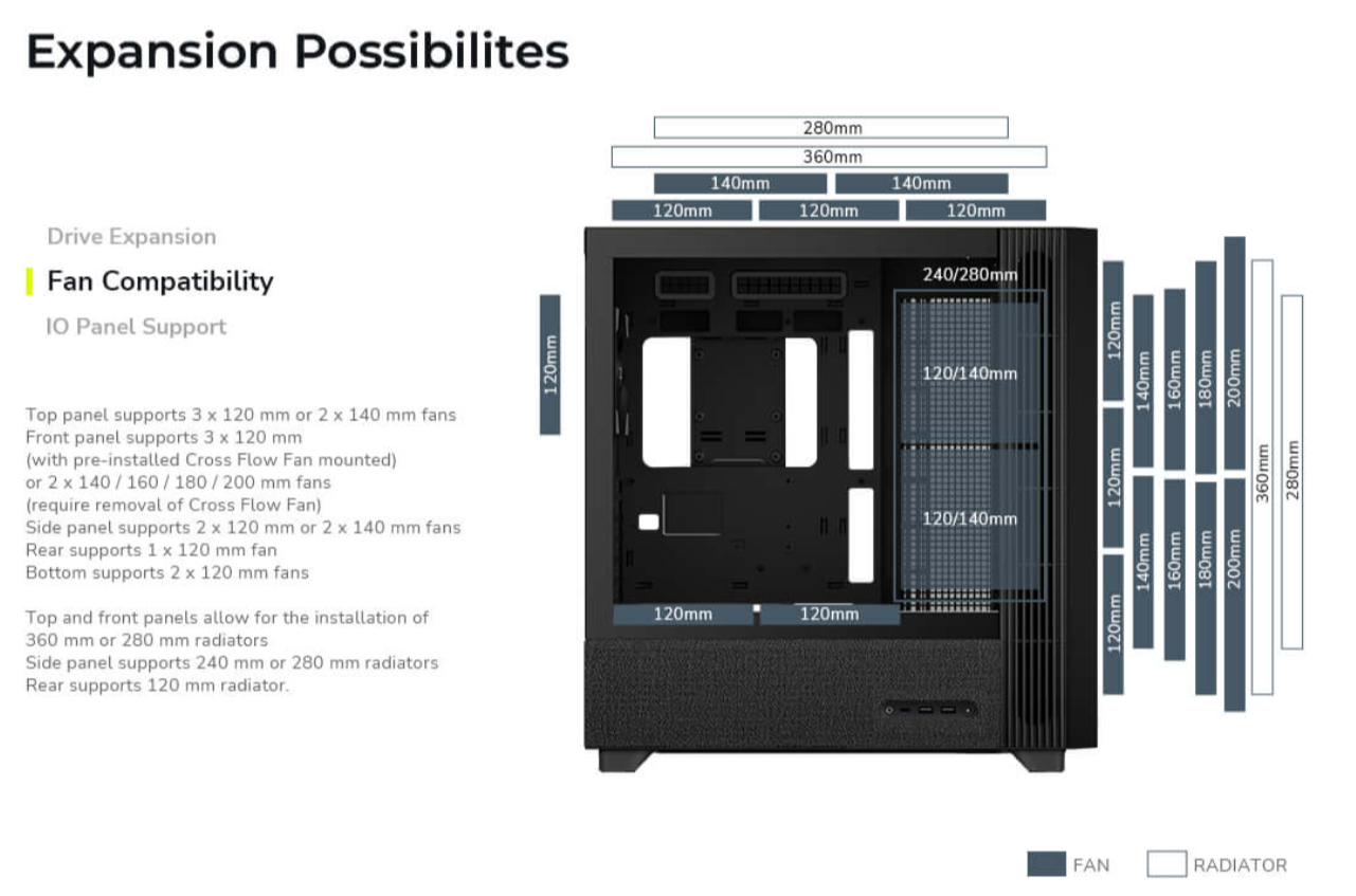 Hệ thống quạt hỗ trợ: Mặt trước 3x120mm/2x140mm, Mặt trên 3x120mm/2x140mm, Mặt sau 1x120mm