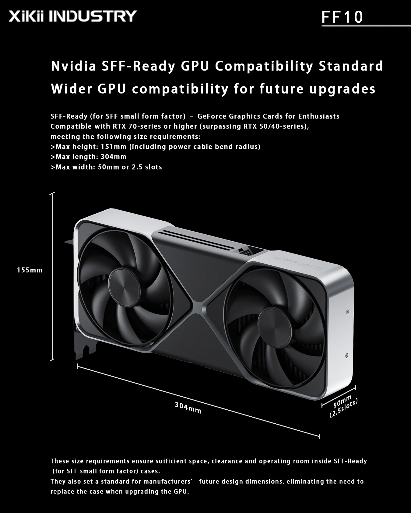 Điểm mạnh cốt lõi của XIKII FF10 là khả năng tương thích tuyệt vời với chuẩn SFF-Ready của Nvidia dành cho các hệ thống nhỏ gọn. Case hỗ trợ card đồ họa có kích thước tối đa 304mm (Dài) x 151mm (Cao) x 50mm (Rộng/2.5 slots). Điều này đảm bảo không gian đủ rộng và thoáng khí cho các GPU Enthusiast thế hệ mới (vượt qua cả RTX 40 series), giúp người dùng yên tâm nâng cấp mà không lo thay đổi vỏ máy.